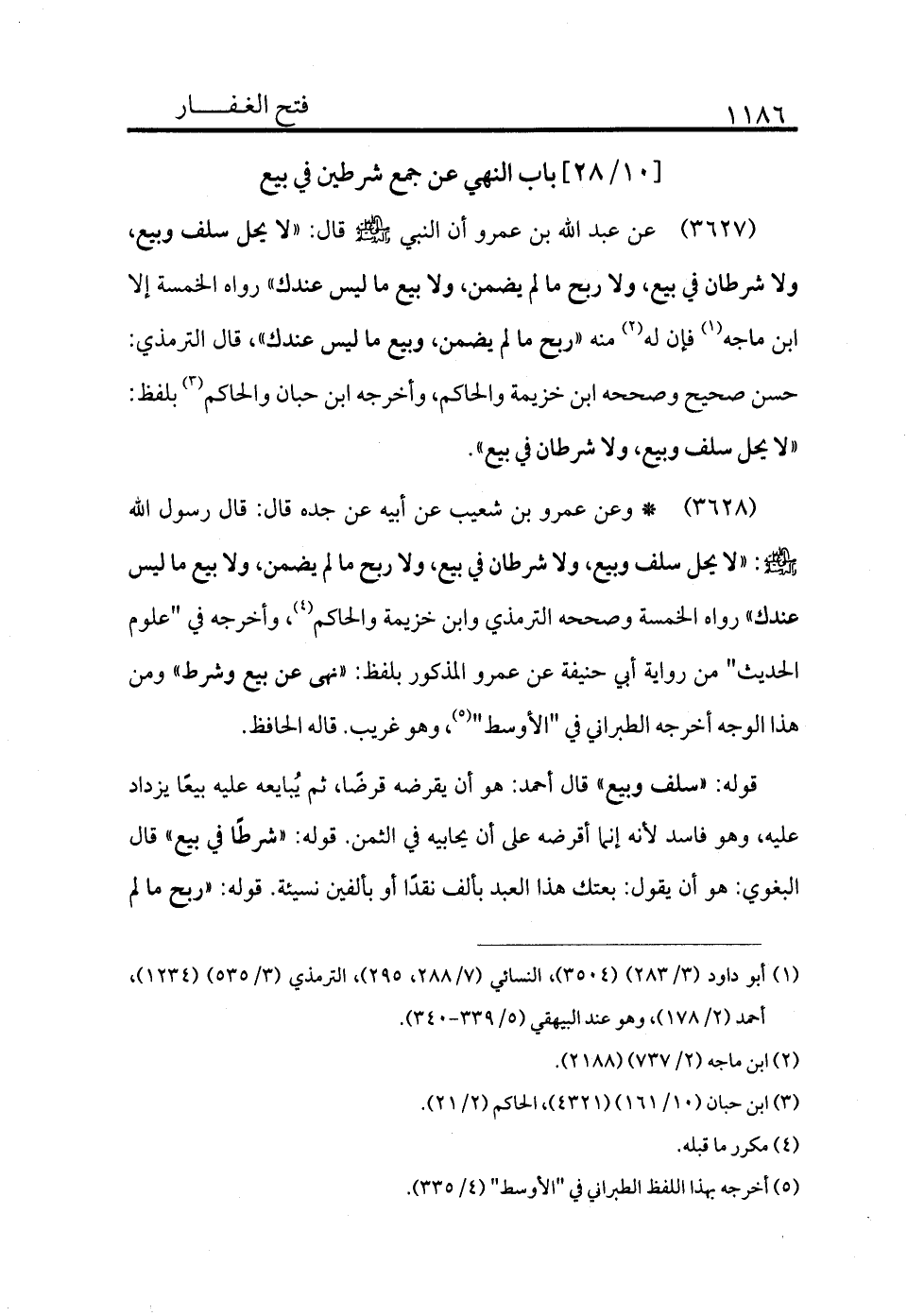 3628 - عن عمرو بن شعيب عن أبيه عن جده قال: قال رسول الله - صلى الله عليه وسلم -: «لا يحل سلف وبيع، ولا شرطان في بيع، ولا ربح ما لم يضمن، ولا بيع ما ليس عندك» رواه الخمسة وصححه الترمذي وابن خزيمة والحاكم (¬4) ، وأخرجه في "علوم الحديث" من رواية أبي حنيفة عن عمرو المذكور بلفظ: «نهى عن بيع وشرط» ومن هذا الوجه أخرجه الطبراني في "الأوسط" (¬5) وهو غريب قاله الحافظ.