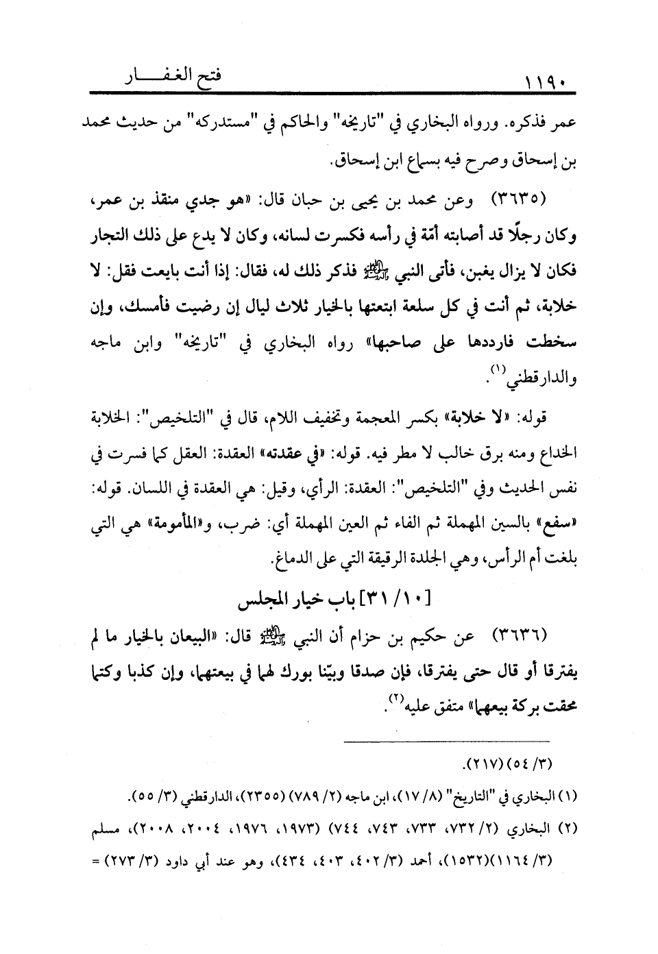 3635 - وعن محمد بن يحيى بن حبان قال: «هو جدي منقذ بن عمر وكان رجلًا قد أصابته أمه في رأسه فكسرت لسانه، وكان لا يدع على ذلك التجار فكان لا يزال يغبن، فأتى النبي - صلى الله عليه وسلم - فذكر ذلك له، فقال: إذا أنت بايعت فقل: لا خلابة، ثم أنت في كل سلعة ابتعتها بالخيار ثلاث ليال إن رضيت فأمسك، وإن سخطت فارددها على صاحبها» رواه البخاري في "تاريخه" وابن ماجه والدارقطني (¬1) .