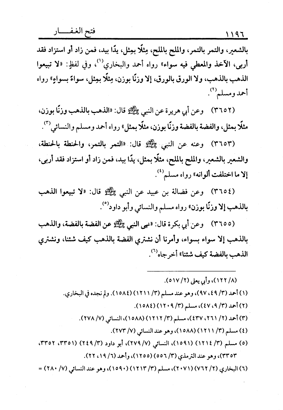 3652 - وعن أبي هريرة عن النبي - صلى الله عليه وسلم - قال: «الذهب بالذهب وزنًا بوزن، مثلًا بمثل، والفضة بالفضة وزنًا بوزن، مثلًا بمثل» رواه أحمد ومسلم والنسائي (¬3) .