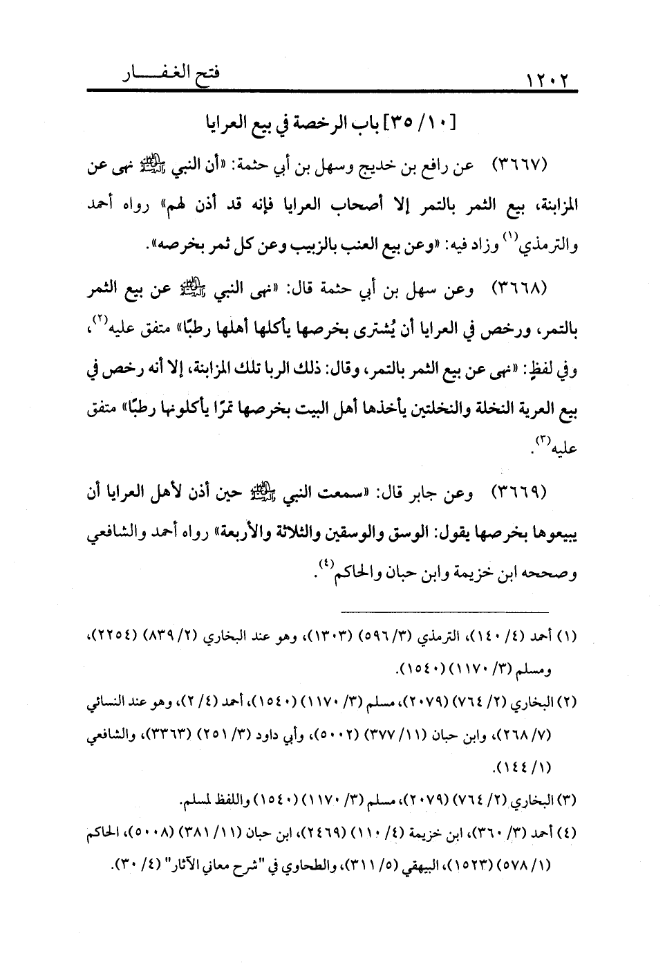 3669 - وعن جابر قال: «سمعت النبي - صلى الله عليه وسلم - حين أذن لأهل العرايا أن يبيعوها بخرصها يقول: الوسق والوسقين والثلاثة والأربعة» رواه أحمد والشافعي وصححه ابن خزيمة وابن حبان والحاكم (¬4) .