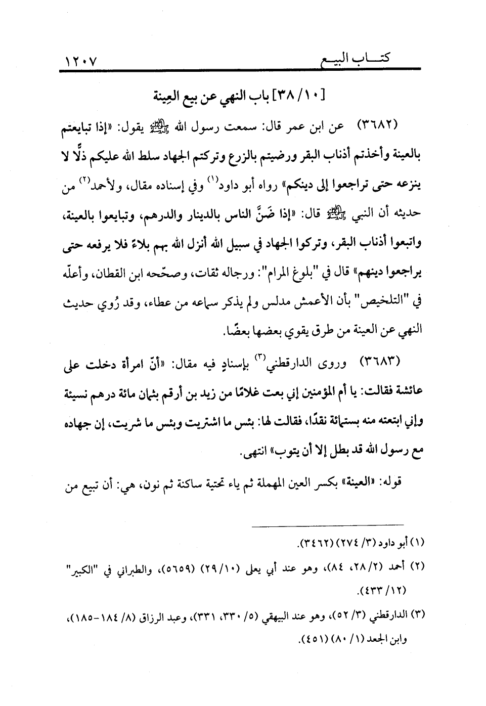 3682 - عن ابن عمر قال: «سمعت رسول الله - صلى الله عليه وسلم - يقول: «إذا تبايعتم بالعينة وأخذتم أذناب البقر ورضيتم بالزرع وتركتم الجهاد سلط الله عليكم ذلًا لا ينزعه حتى تراجعوا دينكم» رواه أبو داود (¬1) وفي إسناده مقال ولأحمد (¬2) من حديثه أن النبي - صلى الله عليه وسلم - قال: «إذا ضن الناس بالدينار والدرهم وتبايعوا بالعينة واتبعوا أذناب البقر وتركوا الجهاد في سبيل الله أنزل الله بهم بلاءً فلا يرفعه حتى يرجعوا إلى دينهم» قال في "بلوغ المرام": ورجاله ثقات وصححه ابن القطان وأعله في "التلخيص" بأن الأعمش مدلس ولم يذكر سماعه من عطاء وقد روى حديث النهي عن العينة من طرق يقوي بعضها بعضًا.