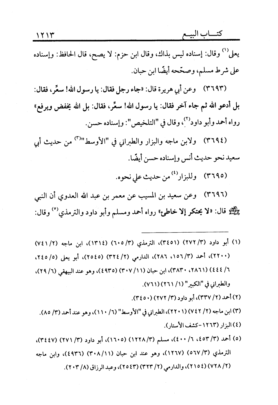 3693 - وعن أبي هريرة قال: «جاء رجل فقال: يا رسول الله! سعر، فقال: بل أدعو الله ثم جاء آخر فقال: يا رسول الله! سعر، فقال: بل الله يخفض ويرفع» رواه أحمد وأبو داود (¬2) وقال في "التلخيص": وإسناده حسن.