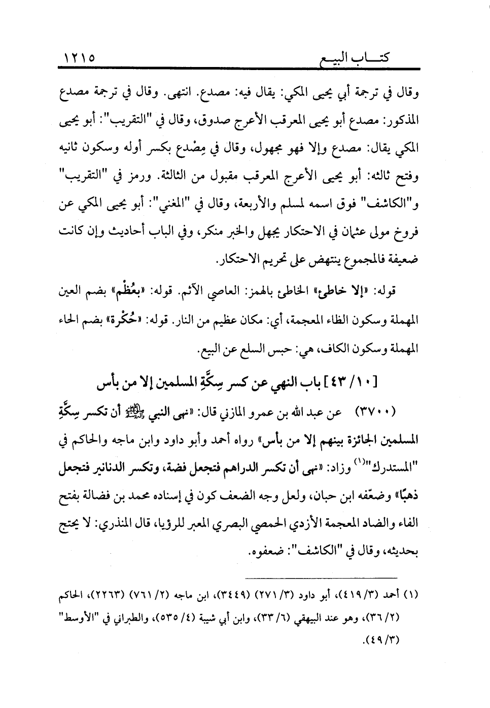 3700 - عن عبد الله بن عمرو المازني قال: «نهى النبي - صلى الله عليه وسلم - أن تكسر سكة المسلمين الجائزة بينهم إلا من بأس» رواه أحمد وأبو داود وابن ماجه والحاكم في "المستدرك" (¬1) وزاد: «نهى أن تكسر الدراهم فتجعل فضة وتكسر الدنانير فتجعل ذهبًا» وضعفه ابن حبان ولعل وجه الضعف كون في إسناده محمد بن فضالة بفتح الفاء والضاد المعجمة الأزدي الحمصي البصري المعبر للرؤيا، قال المنذري: لا يحتج بحديثه، وقال في "الكاشف": ضعفوه.