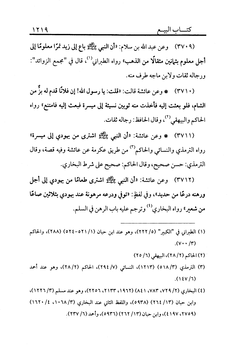 3709 - وعن عبد الله بن سلام: «أن النبي - صلى الله عليه وسلم - باع إلى زيد تمرًا معلومًا إلى أجل معلوم بثمانين مثقالًا من الذهب» رواه الطبراني (¬1) قال في "مجمع الزوائد": ورجاله ثقات ولابن ماجه طرق منه.