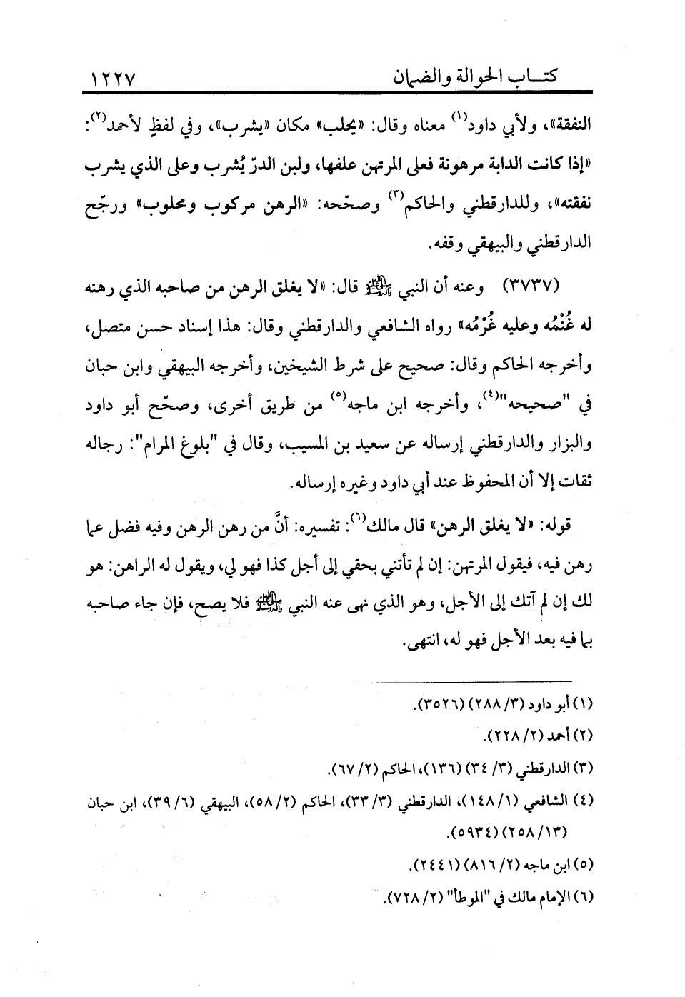 3737 - وعنه أن النبي - صلى الله عليه وسلم - قال: «لا يغلق الرهن من صاحبه الذي رهنه له غنمه وعليه غرمه» رواه الشافعي والدارقطني وقال: هذا إسناد حسن متصل، وأخرجه الحاكم وقال: صحيح على شرط الشيخين، وأخرجه البيهقي وابن حبان في "صحيحه" (¬4) ، وأخرجه ابن ماجه (¬5) من طريق أخرى، وصحح أبو داود والبزار والدارقطني إرساله عن سعيد بن المسيب، وقال في "بلوغ المرام": رجاله ثقات إلا أن المحفوظ عند أبي داود وغيره إرساله.