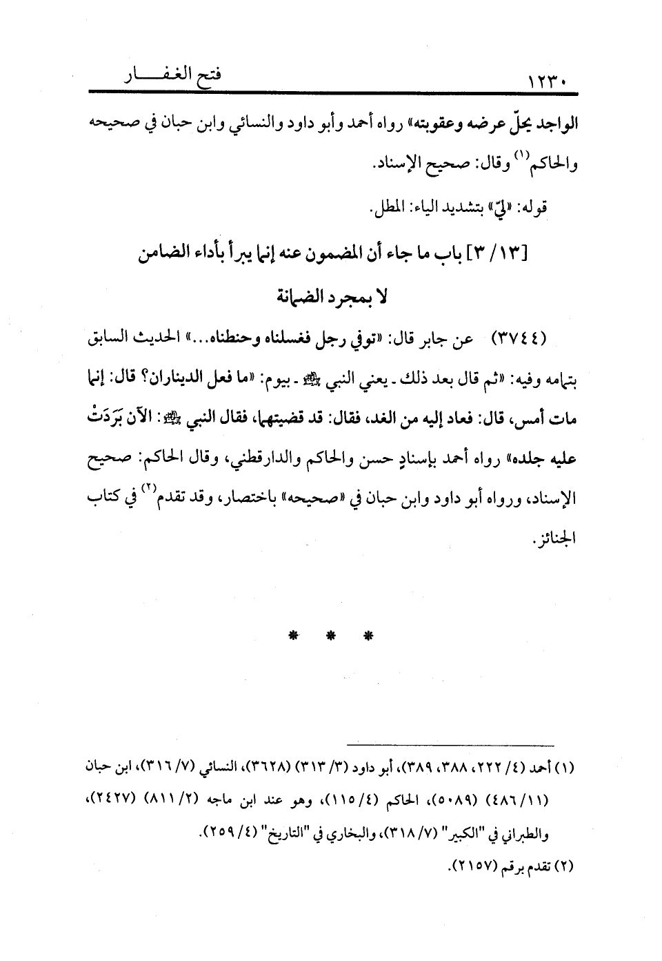 3744 - عن جابر قال: «توفي رجل فغسلناه وحنطناه» الحديث السابق بتمامه وفيه ثم قال بعد ذلك يعني النبي - صلى الله عليه وسلم - بيوم «ما فعل الديناران؟ قال: إنما مات أمس، قال: فعاد إليه من الغد، فقال: قد قضيتهما، فقال النبي - صلى الله عليه وسلم -: الآن بردت عليه جلده» رواه أحمد بإسناد حسن والحاكم والدارقطني وقال الحاكم: صحيح الإسناد. ورواه أبو داود وابن حبان في صحيحه باختصار وقد تقدم (¬2) في كتاب الجنائز.