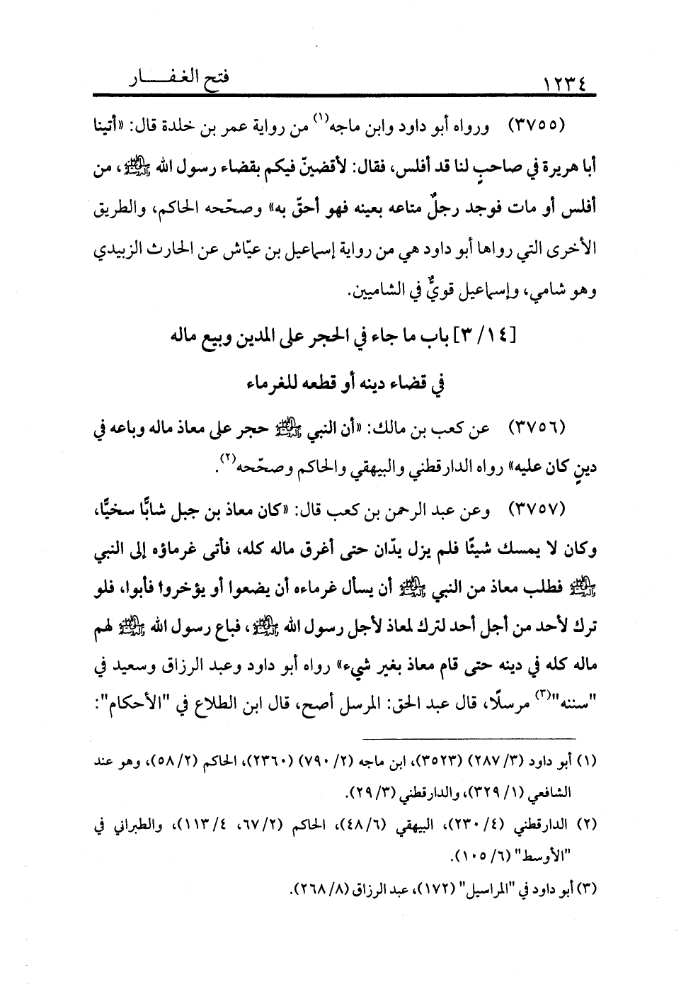 3756 - عن كعب بن مالك: «أن النبي - صلى الله عليه وسلم - حجر على معاذ ماله وباعه في دين كان عليه» رواه الدارقطني والبيهقي والحاكم وصححه (¬2) .