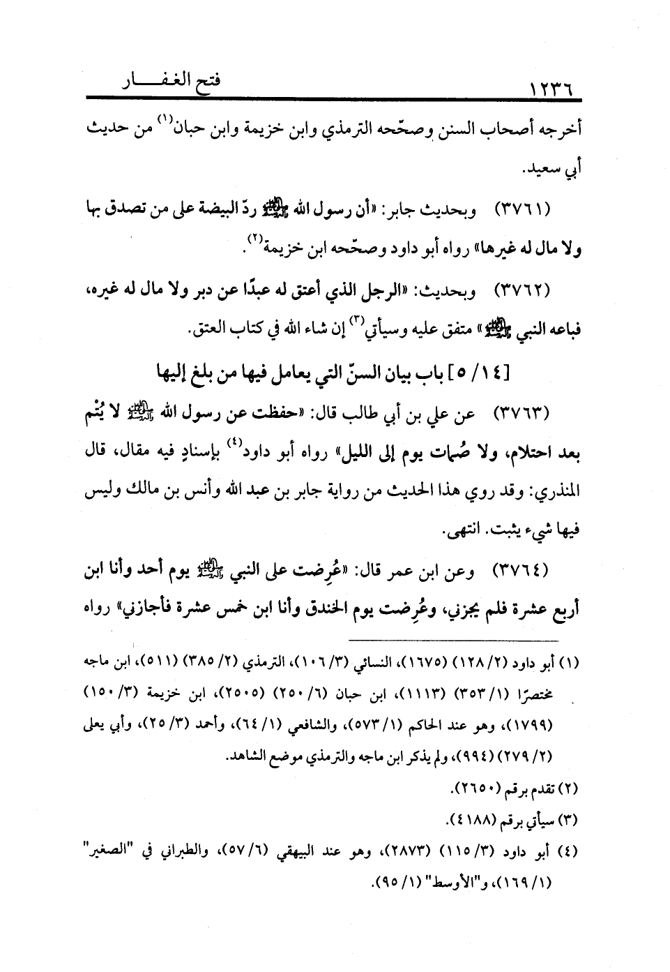 3764 - وعن ابن عمر قال: «عرضت على النبي - صلى الله عليه وسلم - يوم أحد وأنا ابن أربع عشرة فلم يجزني، وعرضت يوم الخندق وأنا ابن خمس عشرة فأجازني» رواه