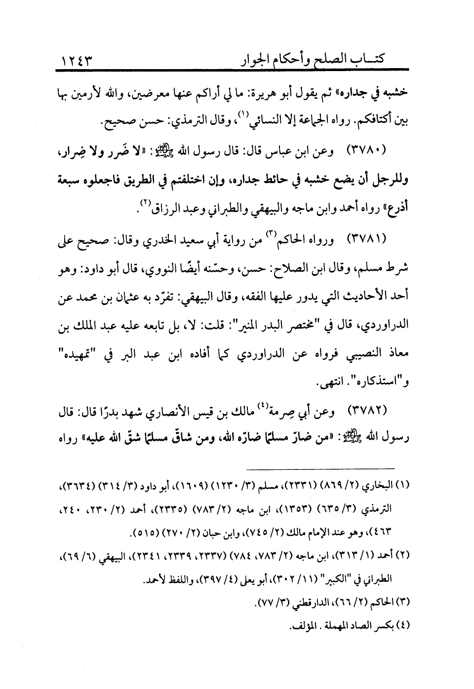 3780 - وعن ابن عباس قال: قال رسول الله - صلى الله عليه وسلم -: «لا ضُر ولا ضِرار وللرجل أن يضع خشبه في حائط جداره وإن اختلفتم في الطريق فاجعلوه سبعة أذرع» رواه أحمد وابن ماجه، والبيهقي والطبراني وعبد الرزاق (¬2) .