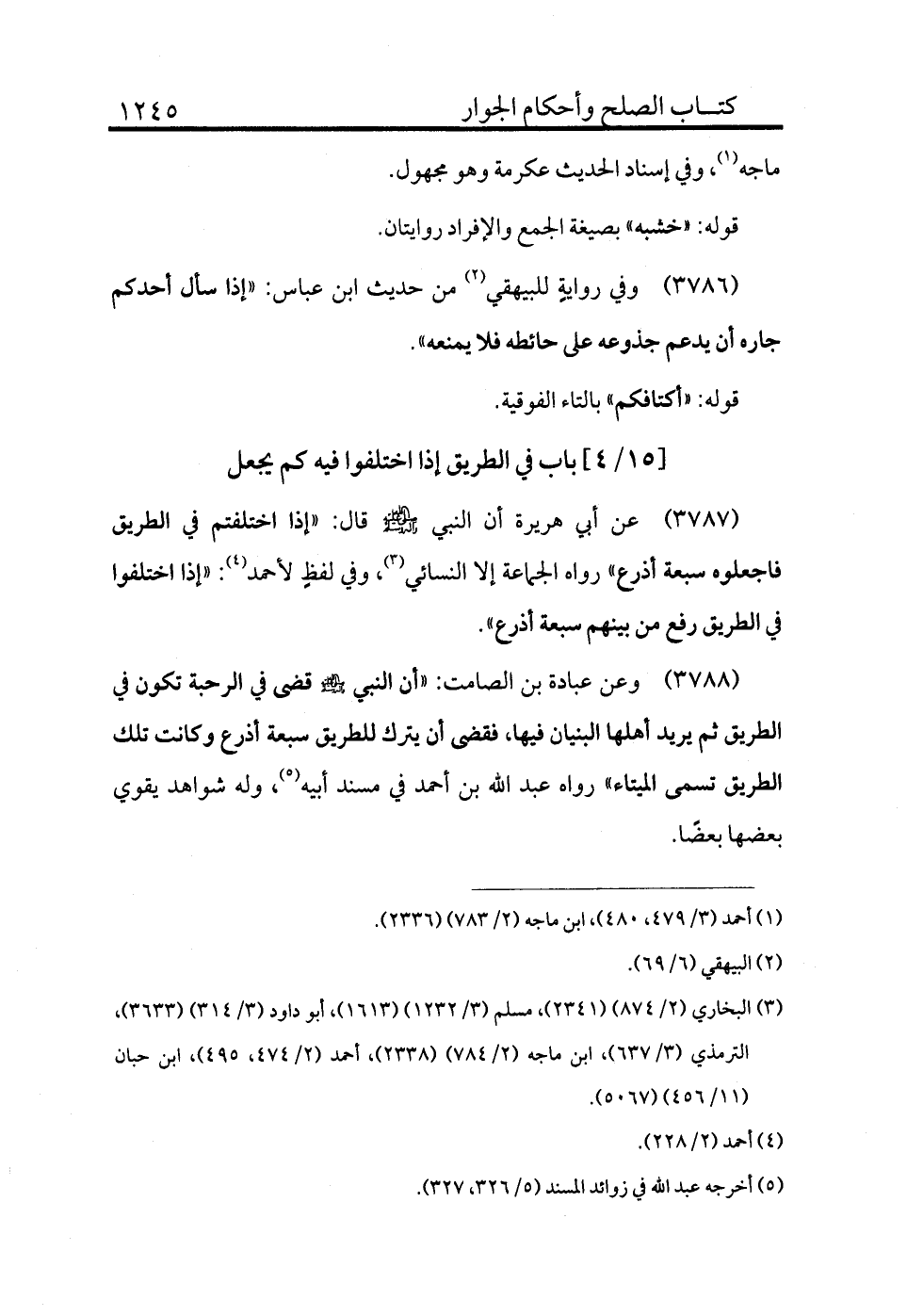 3788 - وعن عبادة بن الصامت «أن النبي - صلى الله عليه وسلم - قضى في الرحبة تكون في الطريق ثم يريد أهلها البنيان فيها فقضا أن يترك للطريق سبعة أذرع وكانت تلك الطريق تسمى الميتاء» رواه عبد الله بن أحمد في مسند أبيه (¬5) وله شواهد يقوي بعضها بعضًا.
