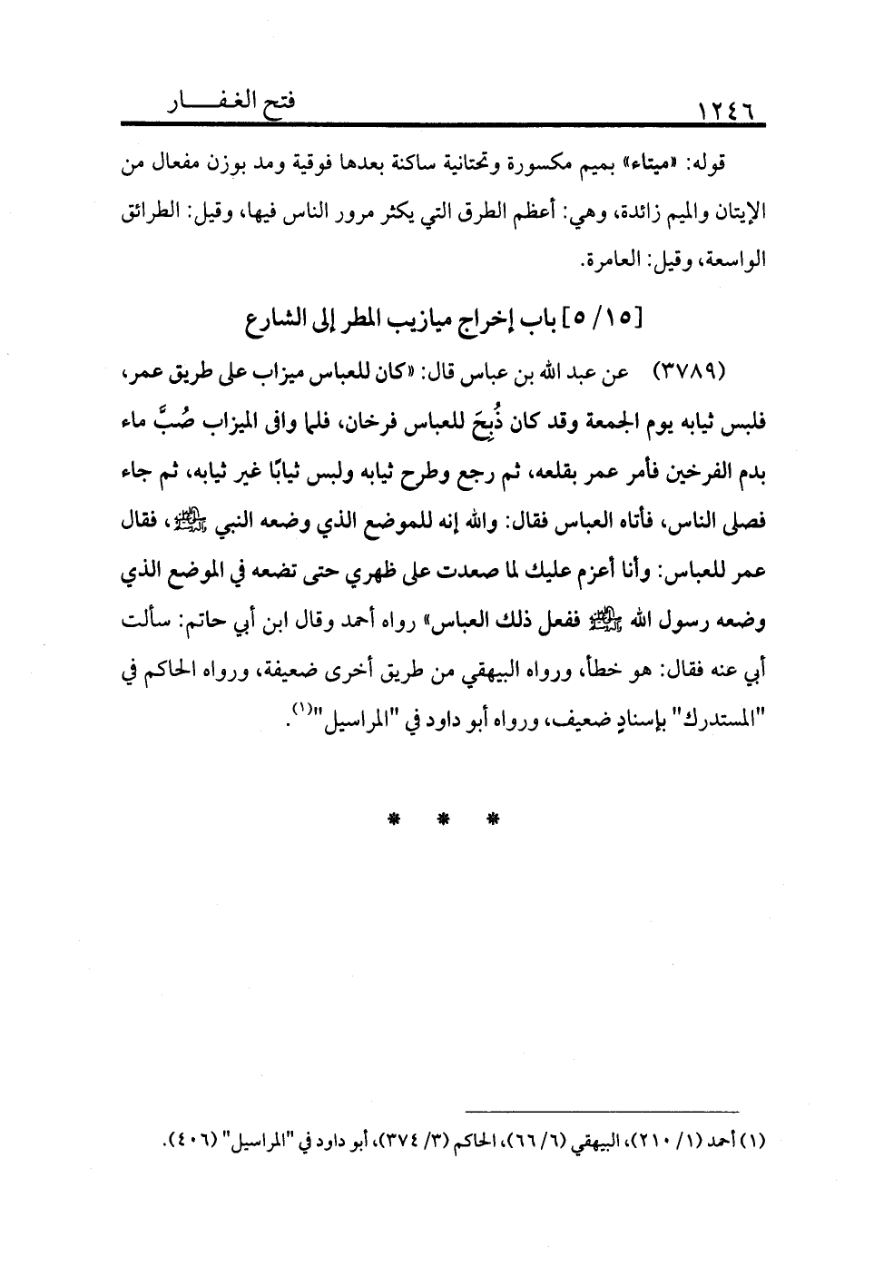 3789 - عن عبد الله بن عباس قال: «كان للعباس ميزاب على طريق عمر فلبس ثيابه يوم الجمعة وقد كان ذبح للعباس فرخان، فلما وافى الميزاب صب ماء بدم الفرخين فأمر عمر بقلعه، ثم رجع وطرح ثيابه ولبس ثيابًا غير ثيابه ثم جاء فصلى الناس، فأتاه العباس فقال: والله إنه للموضع الذي وضعه النبي - صلى الله عليه وسلم - فقال عمر للعباس: وأنا أعزم عليك لما صعدت على ظهري حتى تضعه في الموضع الذي وضعه رسول الله - صلى الله عليه وسلم - ففعل ذلك العباس» رواه أحمد وقال ابن أبي حاتم: سألت أبي عنه فقال هو خطأ، ورواه البيهقي من طريق أخرى ضعيفة، ورواه الحاكم في "المستدرك" بإسناد ضعيف، ورواه أبو داود في "المراسيل" (¬1) .