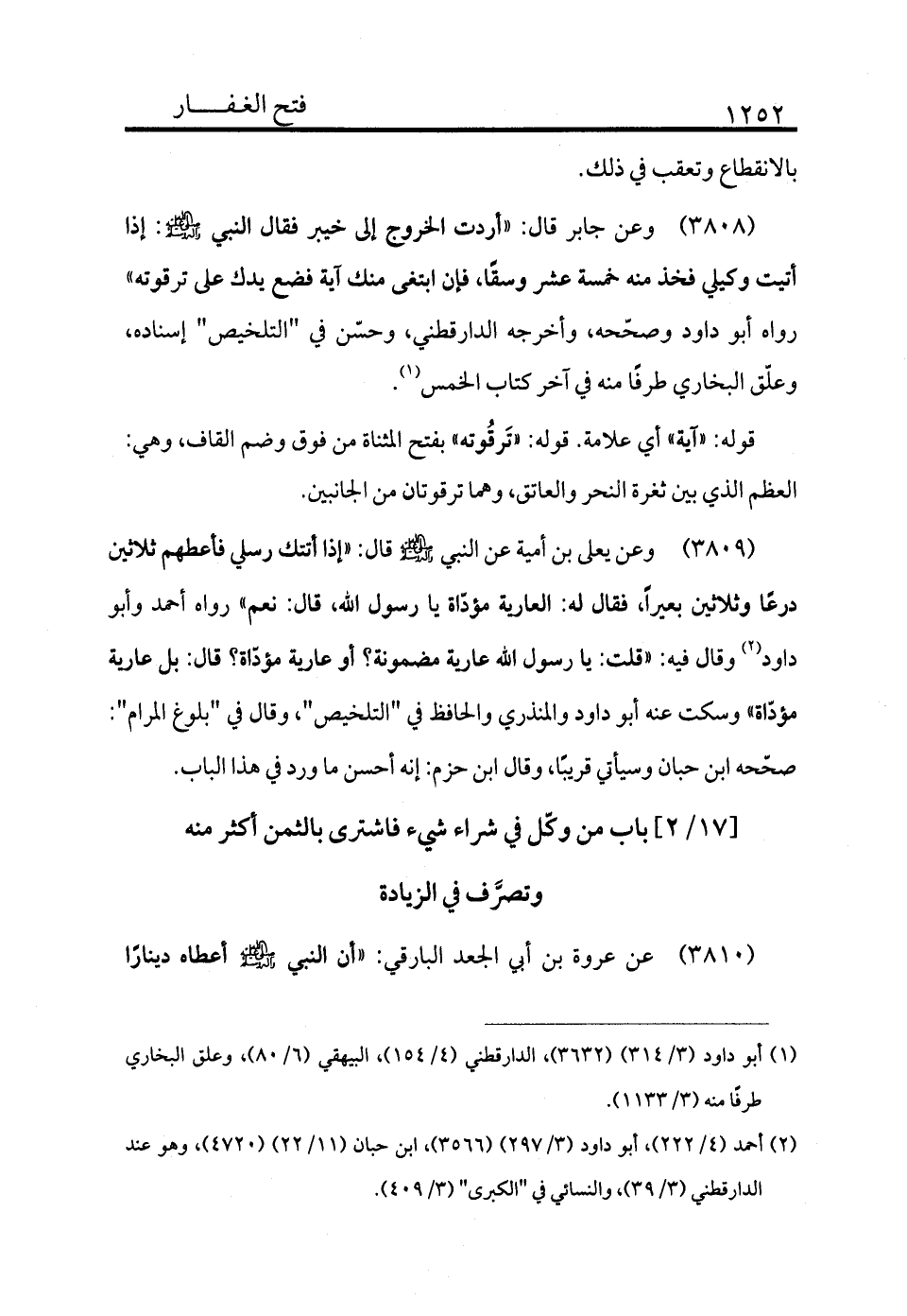 3808 - وعن جابر قال: «أردت الخروج إلى خيبر فقال النبي - صلى الله عليه وسلم -: إذا أتيت وكيلي فخذ منه خمسة عشر وسقًا، فإن ابتغا منك آية فضع يديك على ترقوته» رواه أبو داود وصححه وأخرجه الدارقطني وحسن في "التلخيص" إسناده وعلق البخاري طرفًا منه في آخر كتاب الخمس (¬1) .