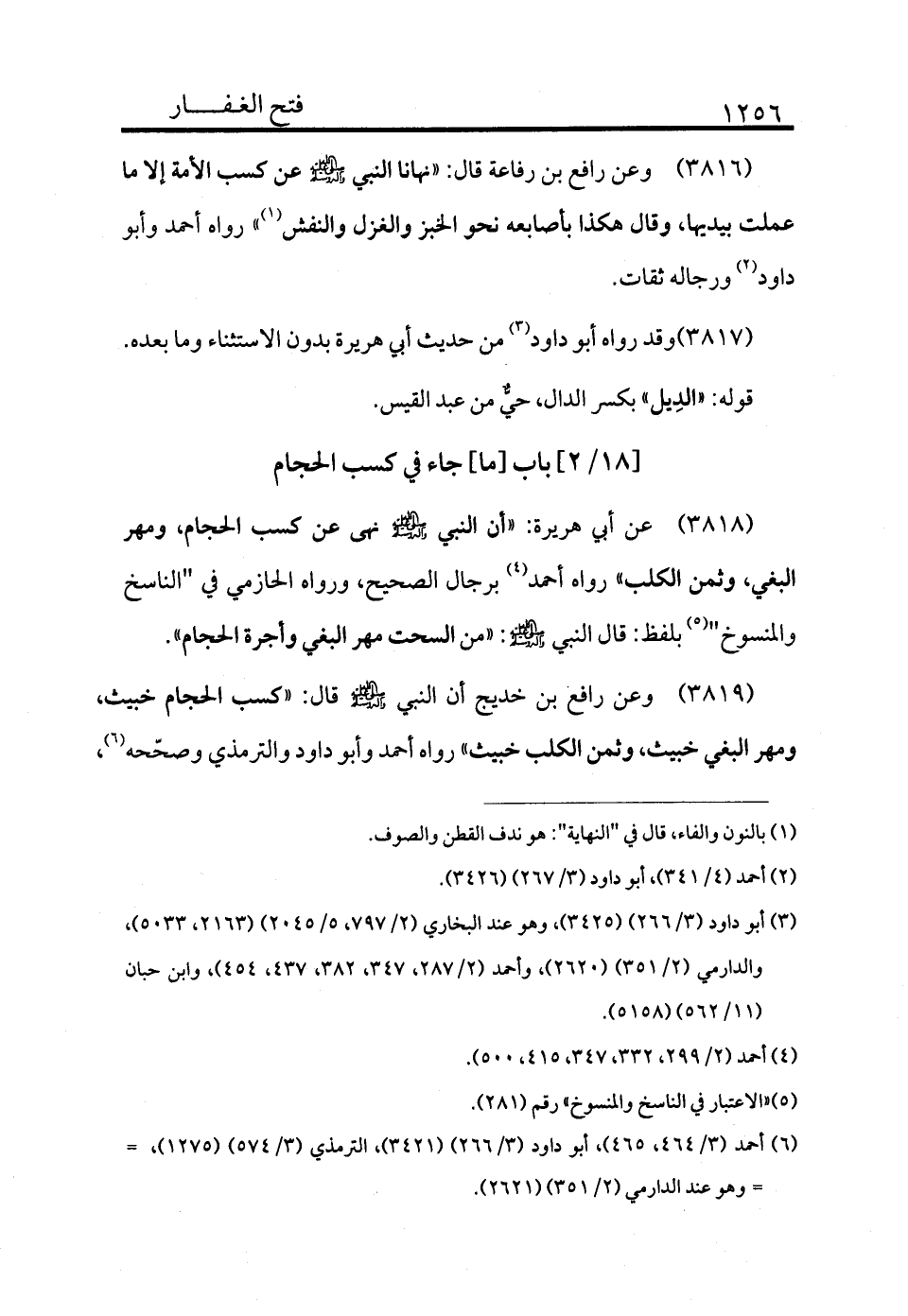 3816 - وعن رافع بن رفاعة قال: «نهانا النبي - صلى الله عليه وسلم - عن كسب الأمة إلا ما عملت بيديها، وقال: هكذا بإصبعه نحو الخبز والغزل والنفش (¬1) » رواه أحمد وأبو داود (¬2) ورجاله ثقات.