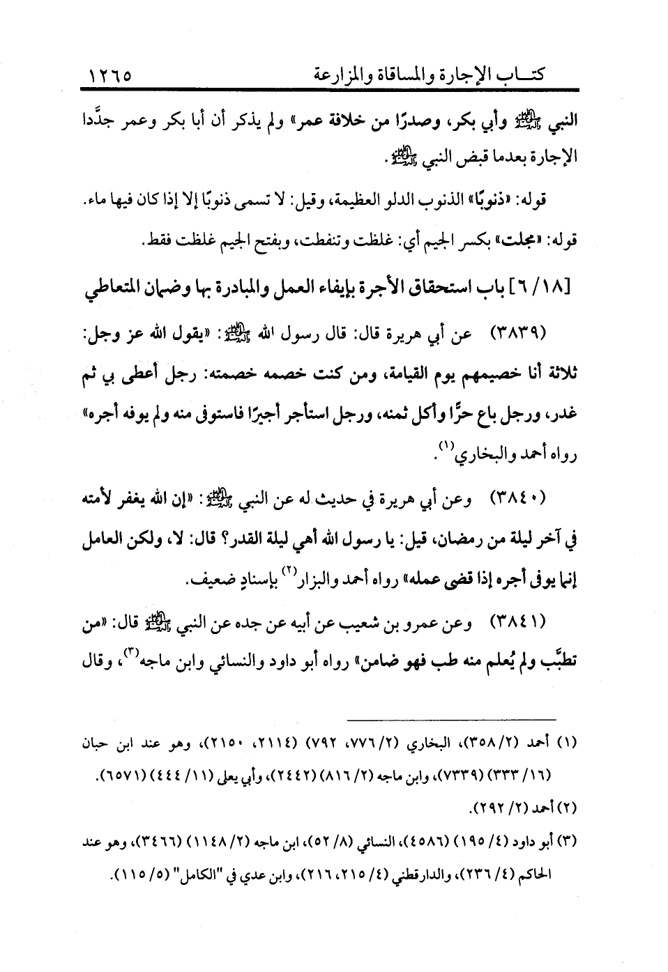 3839 - عن أبي هريرة قال: قال رسول الله - صلى الله عليه وسلم -: «يقول الله عز وجل ثلاثة أنا خصيمهم يوم القيامة، ومن كنت خصمه خصمته: رجل أعطا بي ثم غدر، ورجل باع حرًا وأكل ثمنه، ورجل استأجر أجيرًا فاستوفا منه ولم يوفه أجره» رواه أحمد والبخاري (¬1) .