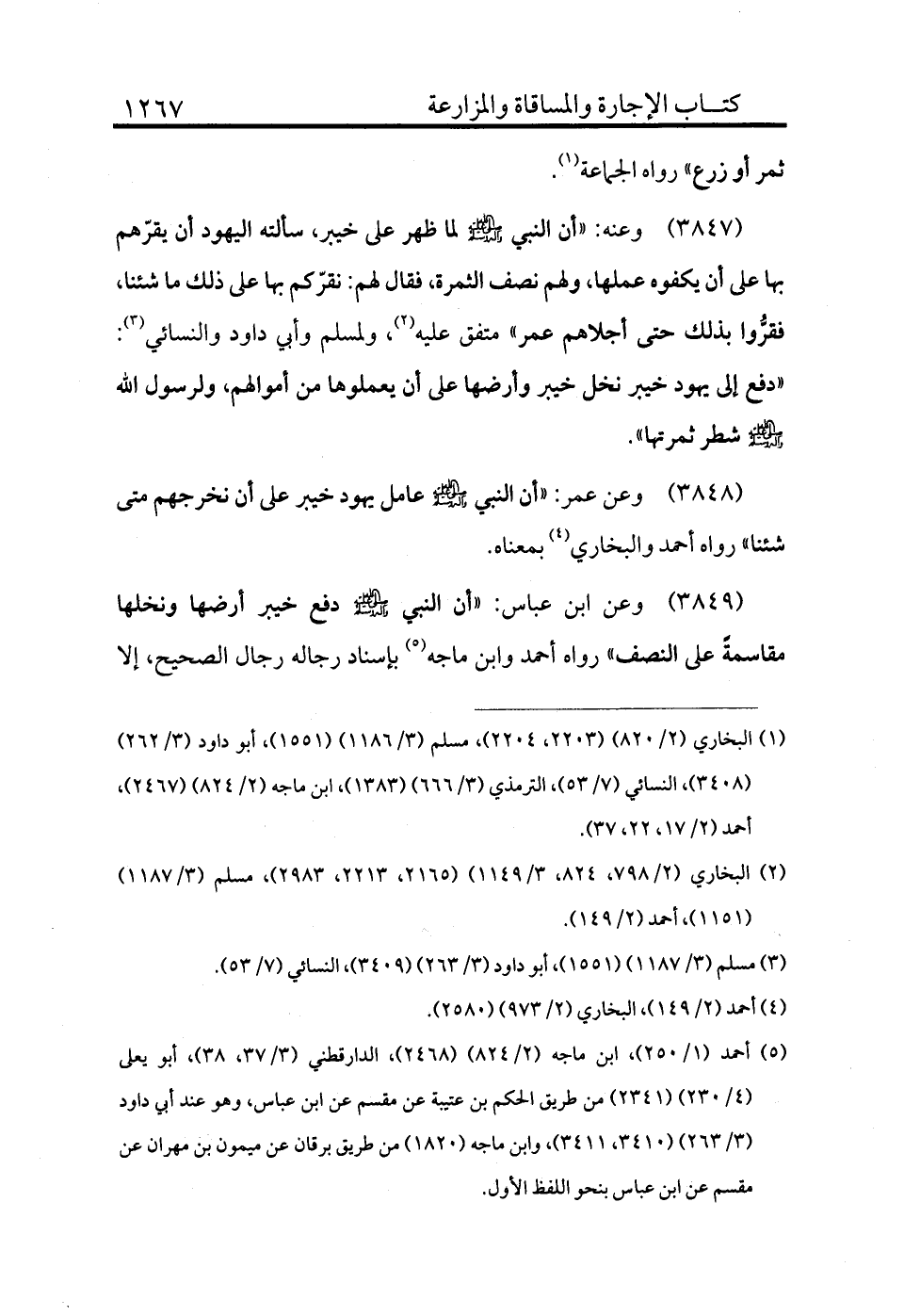 3847 - وعنه «أن النبي - صلى الله عليه وسلم - لما ظهر على خيبر سألته اليهود أن يقرهم بها على أن يكفوه عملها، ولهم نصف الثمرة، فقال لهم: نقركم بها على ذلك ما شئنا فقروا بذلك حتى أجلاهم عمر» متفق عليه (¬2) ، ولمسلم وأبي داود والنسائي (¬3) : «دفع إلى يهود خيبر نخل خيبر وأرضها على أن يعملوها من أموالهم ولرسول الله - صلى الله عليه وسلم - شطر ثمرتها» .