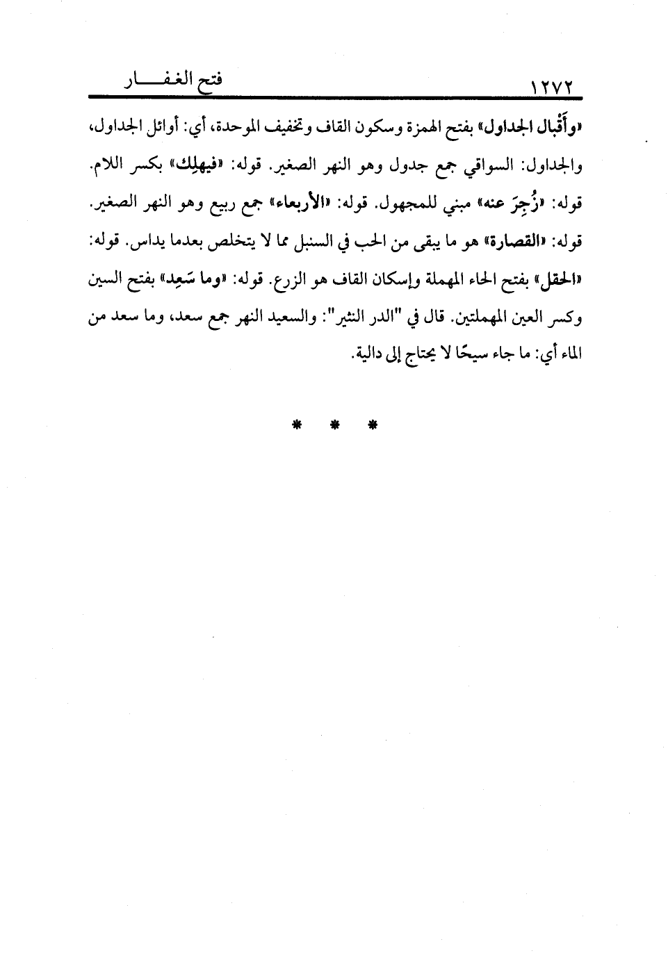 «وإقبال الجداول» بفتح الهمزة وسكون القاف وتخفيف الموحدة أي أوائل الجداول والجداول السواقي جمع جدول وهو النهر الصغير. قوله: «فيهلك» بكسر اللام. قوله: «زجر عنه» مبني للمجهول. قوله: «الأربعاء» جمع ربيع وهو النهر الصغير. قوله: «القصارة» هو ما يبقى من الحب في السنبل مما لا يتخلص بعدما يداس. قوله: «الحقل» بفتح الحاء المهملة وإسكان القاف هو الزرع. قوله: «وما سعد» بفتح السين وكسر العين المهملتين قال في "الدر النثير": والسعيد النهر جمع سعد وما سعد من الماء أي ما جاء سيحًا لا يحتاج إلى داليه.