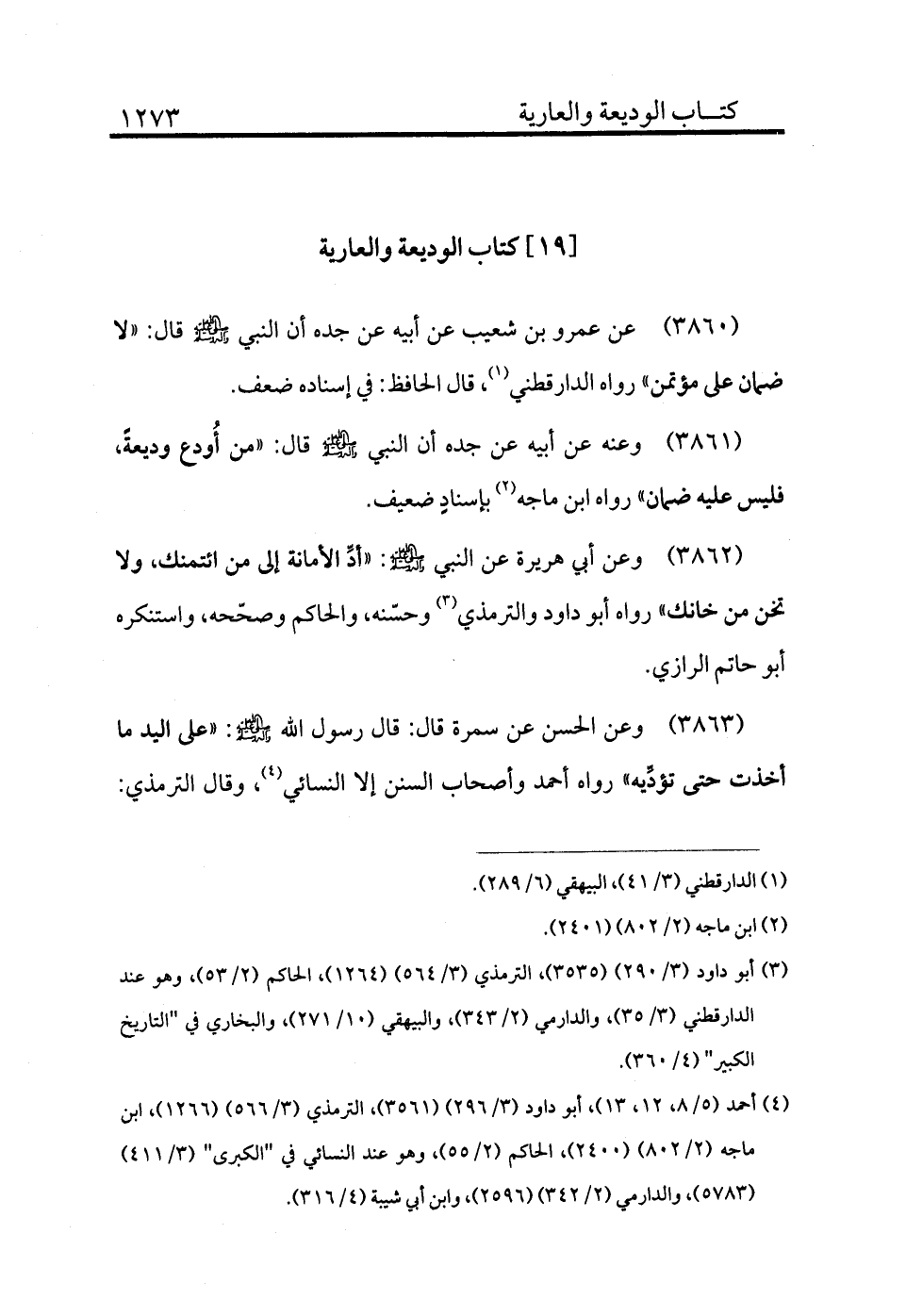 3863 - وعن الحسن عن سمرة قال: قال رسول الله - صلى الله عليه وسلم -: «على اليد ما أخذت حتى تؤديه» رواه أحمد وأصحاب السنن إلا النسائي (¬4) ، وقال الترمذي: