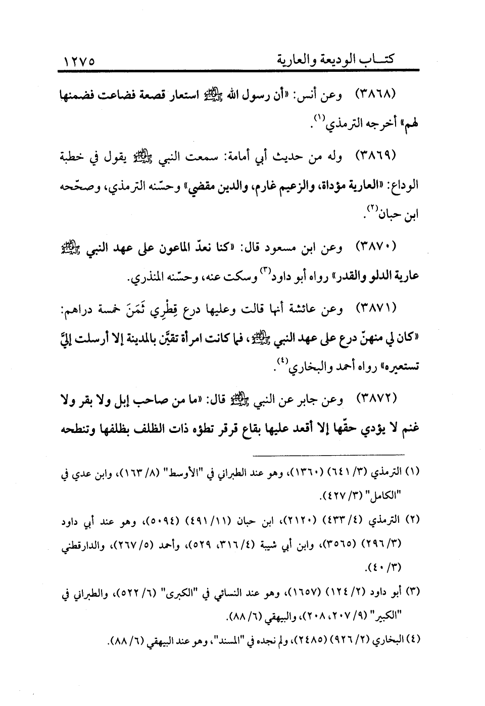 3869 - وله من حديث أبي أمامة: سمعت النبي - صلى الله عليه وسلم - يقول في خطبة الوداع: «العارية مؤداة، والزعيم غارم، والدين مقضي» وحسنه الترمذي، وصححه ابن حبان (¬2) .
