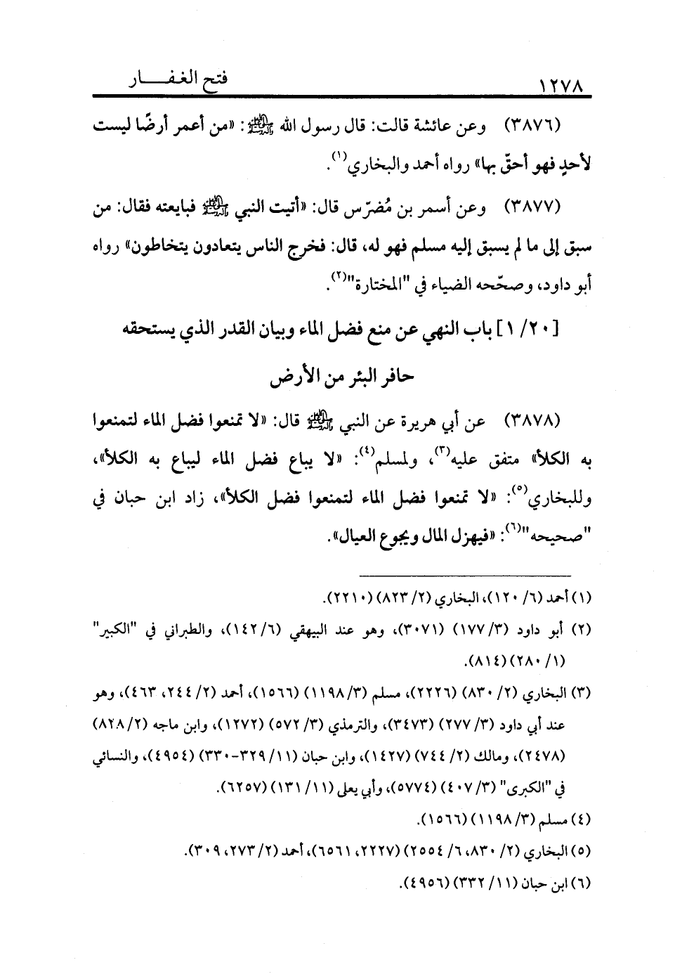 3878 - عن أبي هريرة عن النبي - صلى الله عليه وسلم - قال: «لا تمنعوا فضل الماء لتمنعوا به الكلأ» متفق عليه (¬3) ، ولمسلم (¬4) : «لا يباع فضل الماء ليباع به الكلأ» وللبخاري (¬5) : «لا تمنعوا فضل الماء لتمنعوا فضل الكلأ» زاد ابن حبان في "صحيحه" (¬6) : «فيهزل المال ويجوع العيال» .