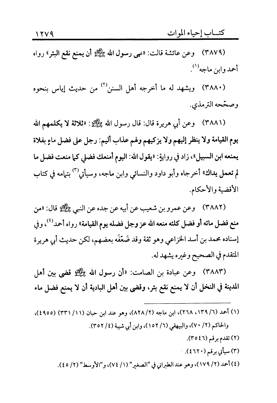 3879 - وعن عائشة قالت: «نهى رسول الله - صلى الله عليه وسلم - أن تمنع نقع البئر» رواه أحمد وابن ماجه (¬1) .