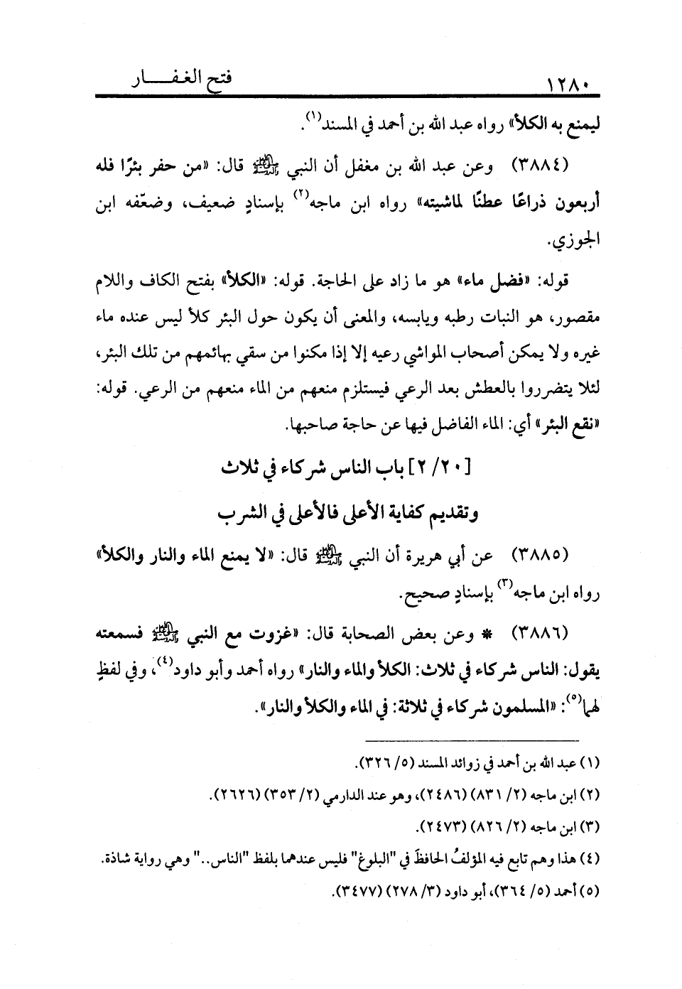 3885 - عن أبي هريرة أن النبي - صلى الله عليه وسلم - قال: «لا يمنع الماء والنار والكلا» رواه ابن ماجه (¬3) بإسناد صحيح.