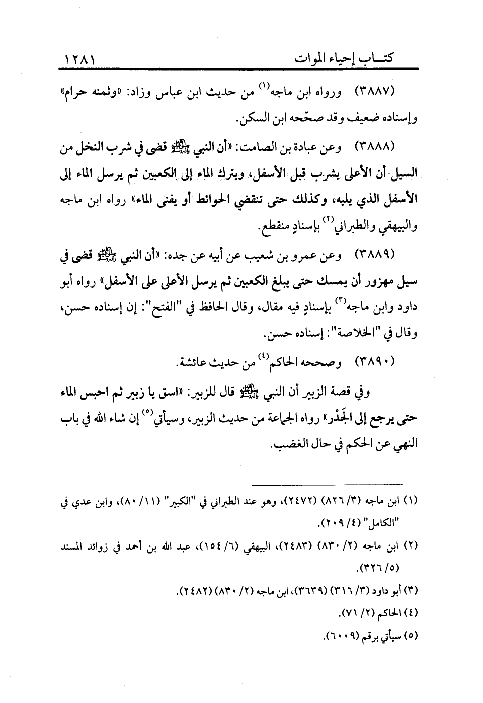 3888 - وعن عبادة بن الصامت «أن النبي - صلى الله عليه وسلم - قضى في شرب النخل من السيل أن الأعلى يشرب قبل الأسفل ويترك الماء إلى الكعبين ثم يرسل الماء إلى الأسفل الذي يليه وكذلك حتى تنقضي الحوايط أو يفنى الماء» رواه ابن ماجه والبيهقي والطبراني (¬2) بإسناد منقطع.