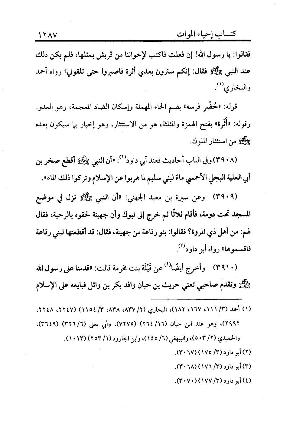 3908 - وفي الباب أحاديث فعند أبي داود (¬2) «أن النبي - صلى الله عليه وسلم - أقطع صخر بن أبي العلية البجلي الأحمسي ماء لبني سليم لما هربوا عن الإسلام وتركوا ذلك الماء» .