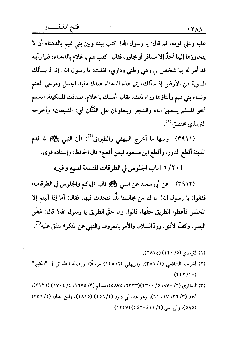 3912 - عن أبي سعيد عن النبي - صلى الله عليه وسلم - قال: «إياكم والجلوس في الطرقات، فقالوا: يا رسول الله! ما لنا من مجالسنا بد، نتحدث فيها فقال: أما إذا أبيتم إلا المجلس فأعطوا الطريق حقها، قالوا: وما حق الطريق يا رسول الله؟ قال: غض البصر، وكف الأذى، ورد السلام، والأمر بالمعروف والنهي عن المنكر» متفق عليه (¬3) .
