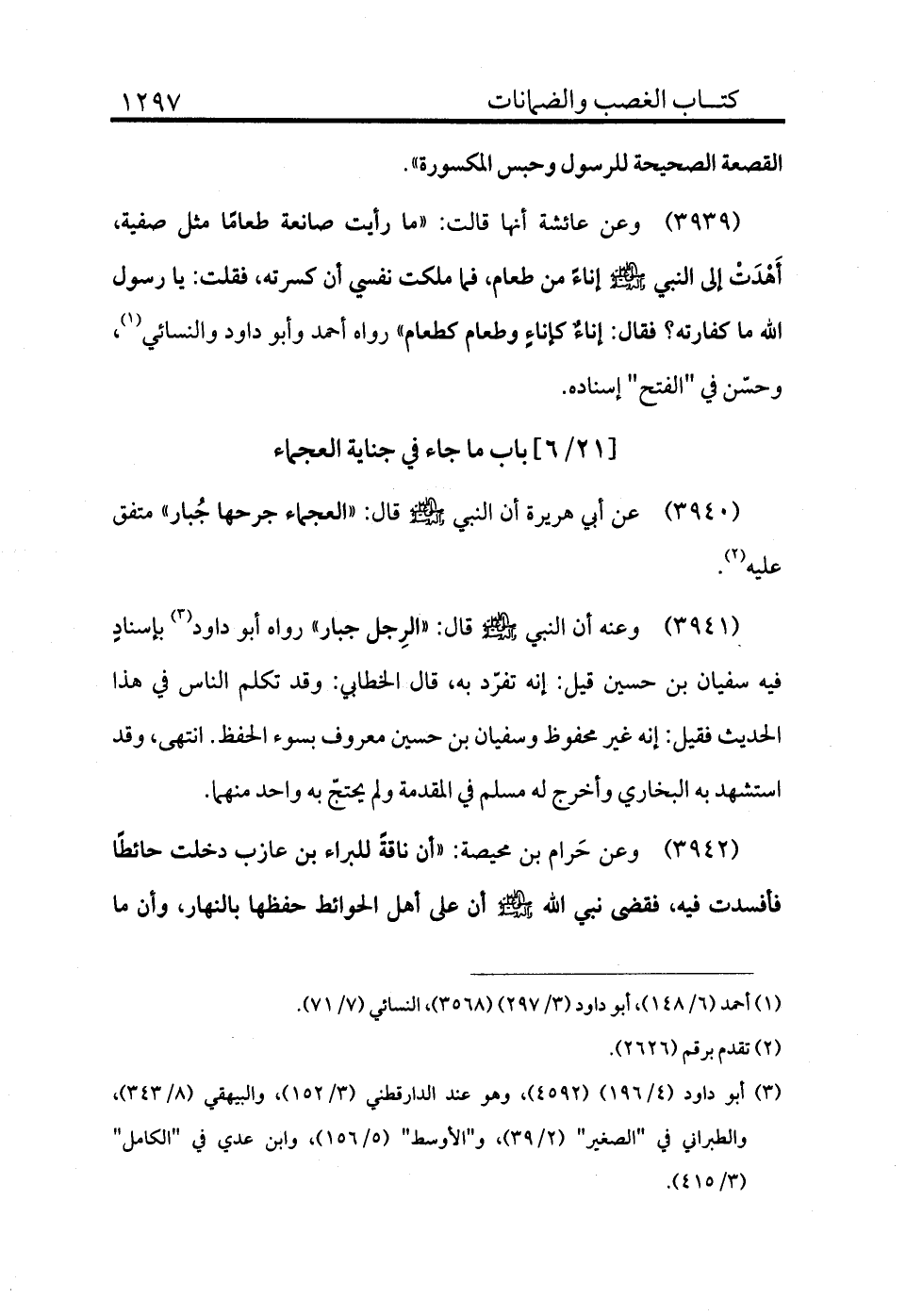 3942 - وعن حِرام بن محيصة «أن ناقة للبراء بن عازب دخلت حايطًا فأفسدت فيه فقضى نبي الله - صلى الله عليه وسلم - أن على أهل الحوايط حفظها بالنهار وأن ما