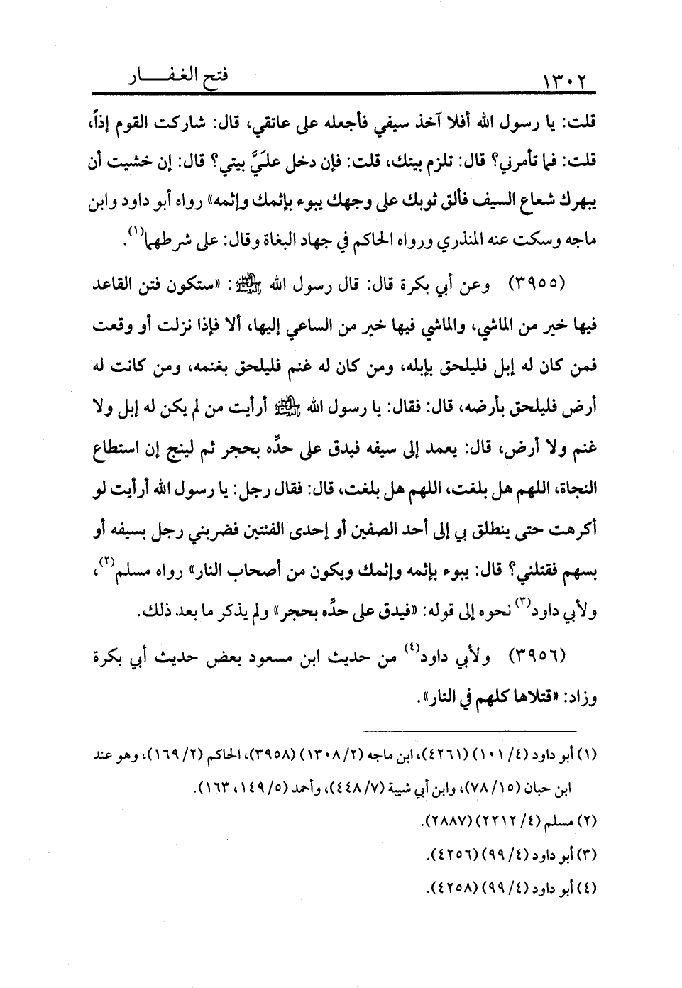 3955 - وعن أبي بكرة قال: قال رسول الله - صلى الله عليه وسلم -: «ستكون فتن القاعد فيها خير من الماشي والماشي فيها خير من الساعي إليها الا فإذا نزلت أو وقعت فمن كان له إبل فليلحق بإبله ومن كان له غنم فليلحق بغنمه، ومن كانت له أرض فليلحق بأرضه قال: فقال: يا رسول الله - صلى الله عليه وسلم - أرأيت من لم يكن له إبل ولا غنم ولا أرض قال: يعمد إلى سيفه فيدق على حده بحجر ثم لينج إن استطاع النجاة، اللهم هل بلغت، اللهم هل بلغت، قال فقال الرجل: يا رسول الله أرأيت لو أكرهت حتى ينطلق بي إلى أحد الصفين أو إحدى الفئتين فضربني رجل بسيفه أو بسهم فقتلني، قال: يبوء بإثمه وإثمك ويكون من أصحاب النار» رواه مسلم (¬2) ولأبي داود (¬3) نحوه إلى قوله: «فيدق على حده بحجر» ولم يذكر ما بعد ذلك.