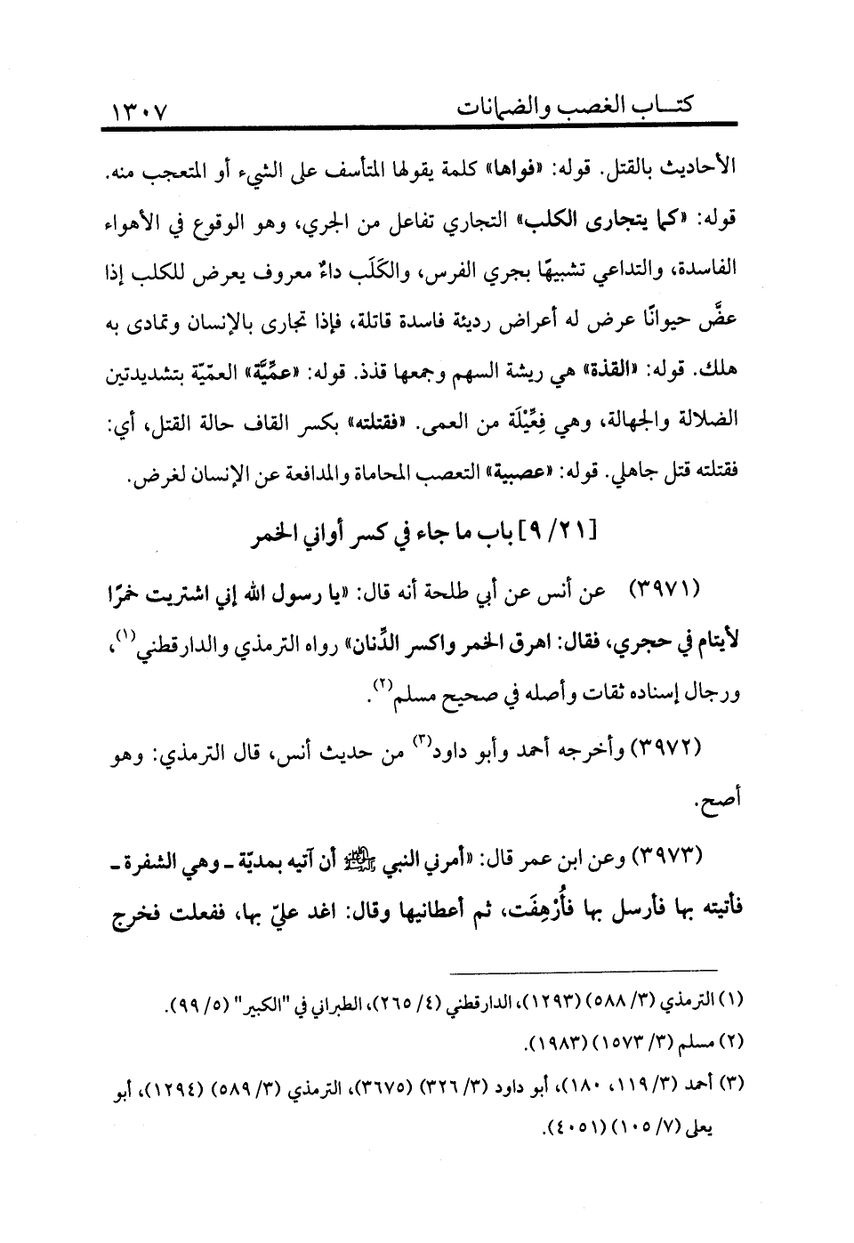 3971 - عن أنس عن أبي طلحة قال: «يا رسول الله إني اشتريت خمرًا لأيتام في حجري فقال: اهرق الخمر واكسر الدنى» رواه الترمذي والدارقطني (¬1) ورجال إسناده ثقات وأصله في صحيح مسلم (¬2) .
