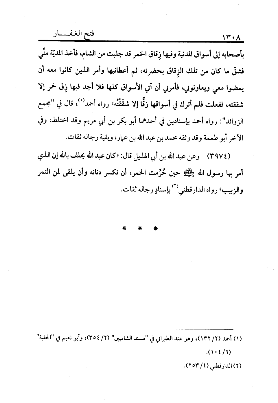 3974 - وعن عبد الله بن أبي الهذيل قال: «كان عبد الله يحلف بالله إن الذي أمر بها رسول الله - صلى الله عليه وسلم - حين حرمت الخمر، أن تكسر دنانه وأن يلقى من التمر والزبيب» رواه الدارقطني (¬2) بإسناد رجاله ثقات.