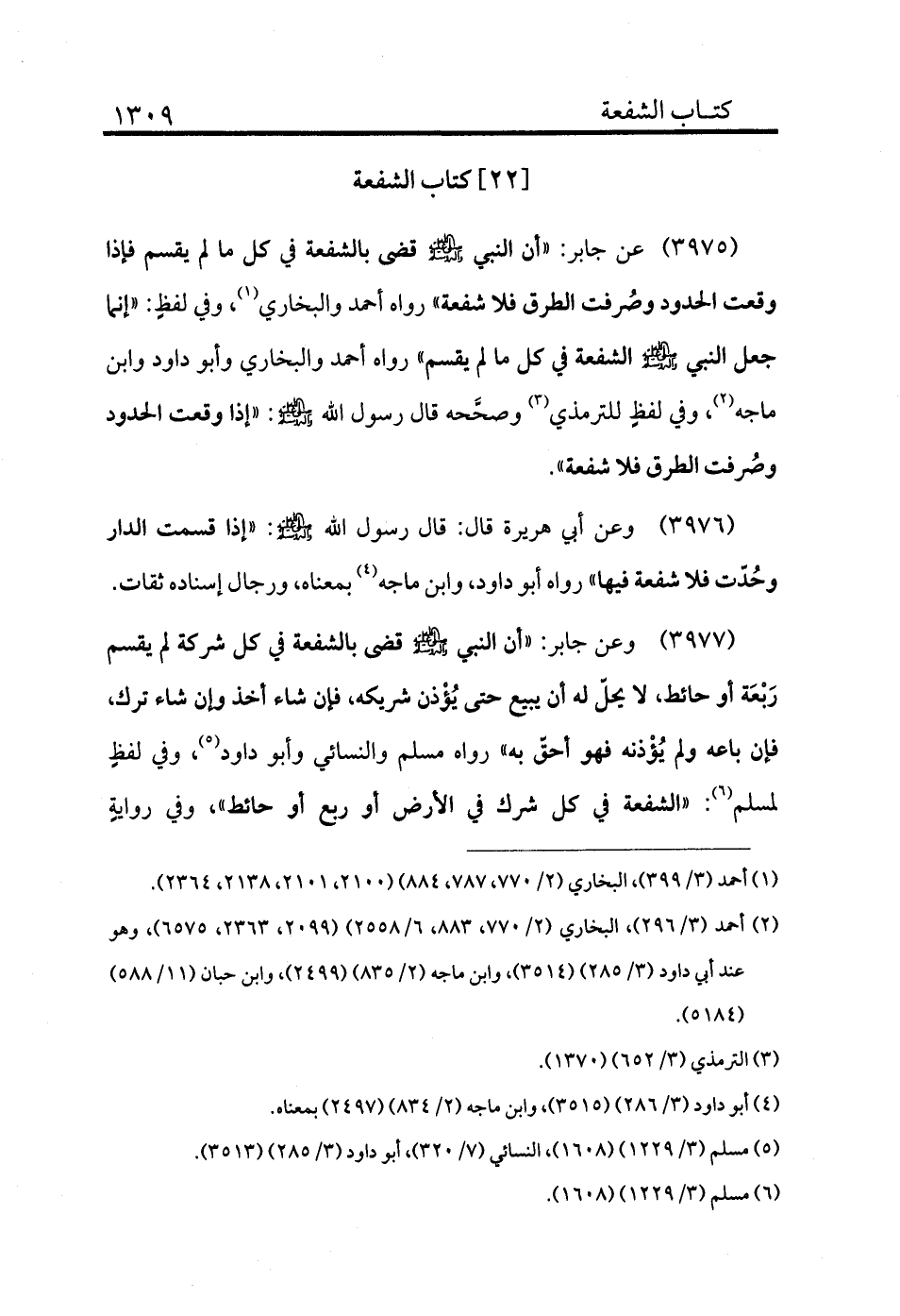 3975 - عن جابر: «أن النبي - صلى الله عليه وسلم - قضى بالشفعة في كل ما لم يقسم فإذا وقعت الحدود وصرفت الطرق فلا شفعة» رواه أحمد والبخاري (¬1) وفي لفظ: «إنما جعل النبي - صلى الله عليه وسلم - الشفعة في كل ما لم يقسم» رواه أحمد والبخاري وأبو داود وابن ماجه (¬2) ، وفي لفظ للترمذي (¬3) وصححه قال رسول الله - صلى الله عليه وسلم -: «إذا وقعت الحدود وصرفت الطرق فلا شفعة» .