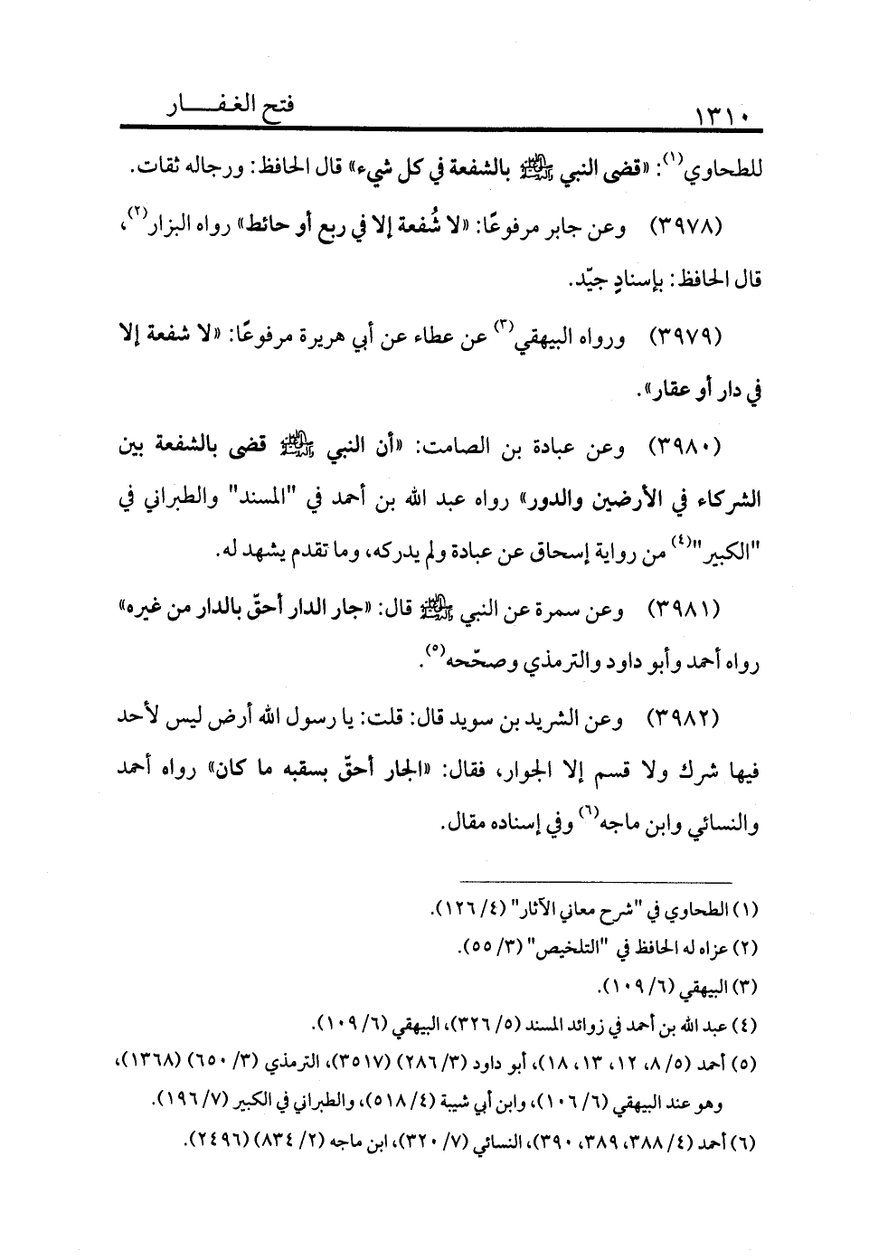 3980 - وعن عبادة بن الصامت: «أن النبي - صلى الله عليه وسلم - قضى بالشفعة بين الشركاء في الأرضين والدور» رواه عبد الله بن أحمد في "المسند" والطبراني في "الكبير" (¬4) من رواية إسحاق عن عبادة ولم يدركه وما تقدم يشهد له.