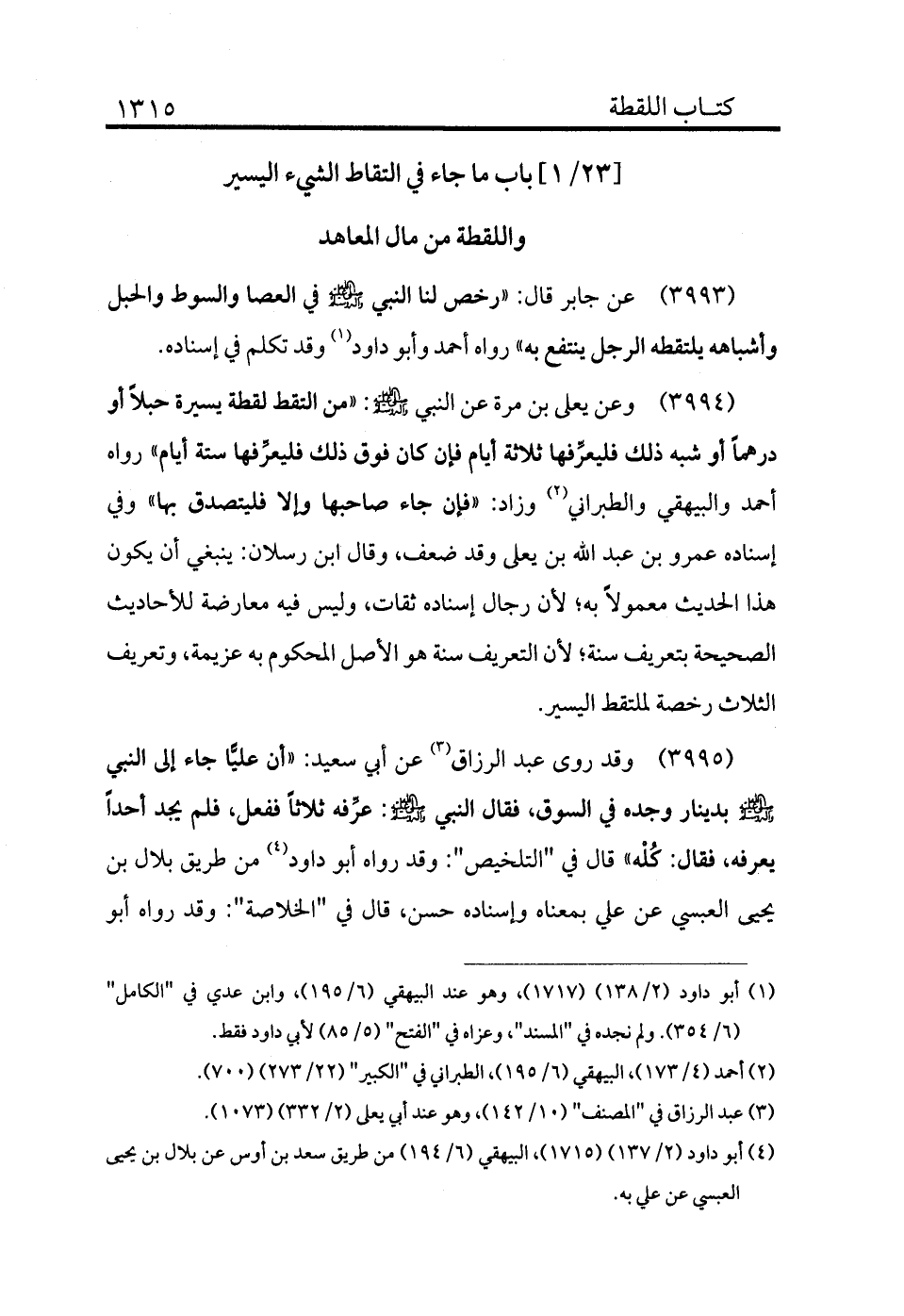 3993 - عن جابر قال: «رخص لنا النبي - صلى الله عليه وسلم - في العصا والسوط والحبل وأشباهه يلتقطه الرجل ينتفع به» رواه أحمد وأبو داود (¬1) وقد تكلم في إسناده.