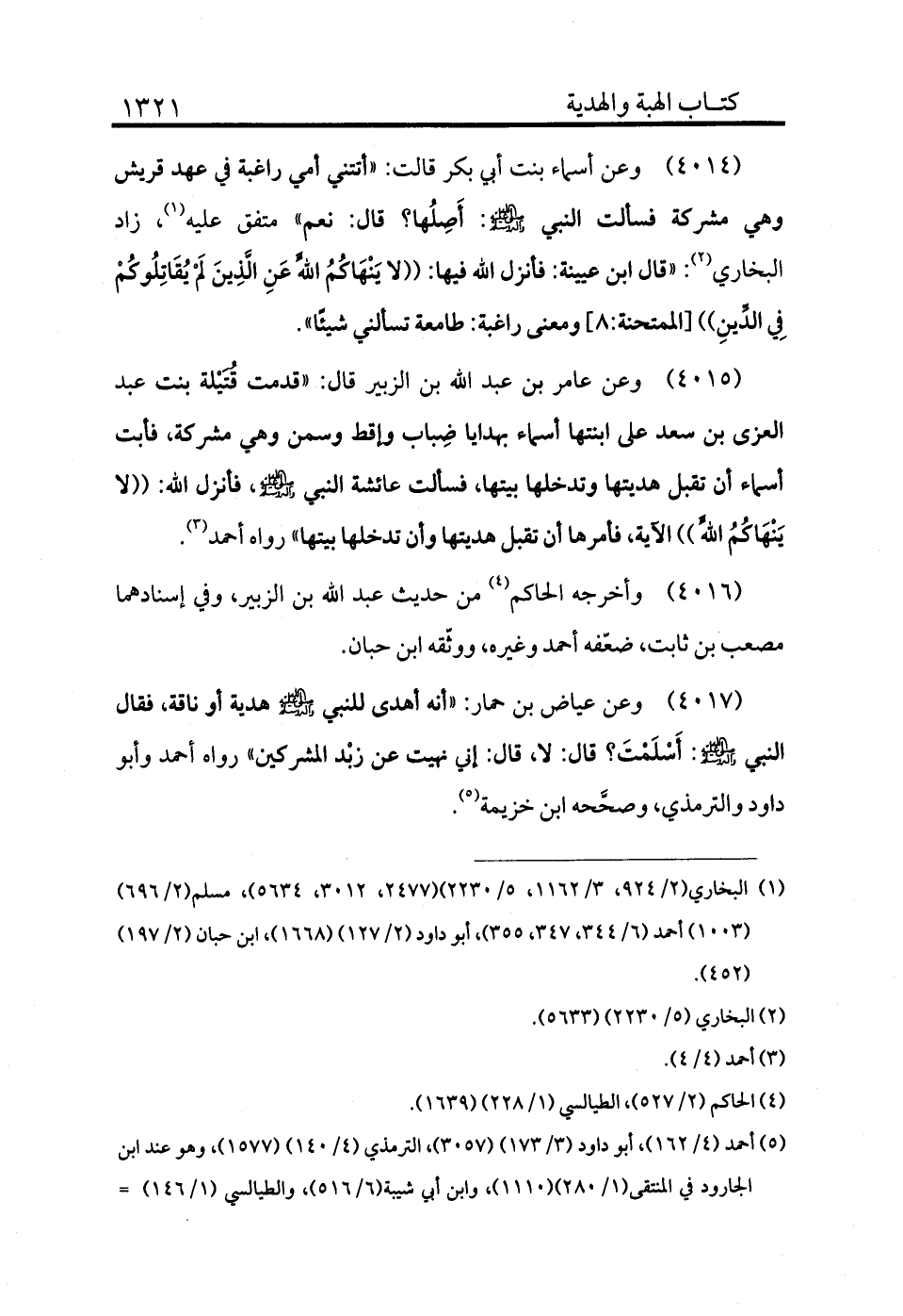 4015 - وعن عامر بن عبد الله بن الزبير قال: «قدمت قتيلة بنت عبد العزى بن سعد على ابنتها أسماء بهدايا ضباب وإقط وسمن وهي مشركة فأبت أسماء أن تقبل هديتها وتدخلها بيتها فسألت عائشة النبي - صلى الله عليه وسلم - فأنزل الله ((لا يَنْهَاكُمُ اللَّهُ)) الآية، فأمرها أن تقبل هديتها وأن تدخلها بيتها» رواه أحمد (¬3) .