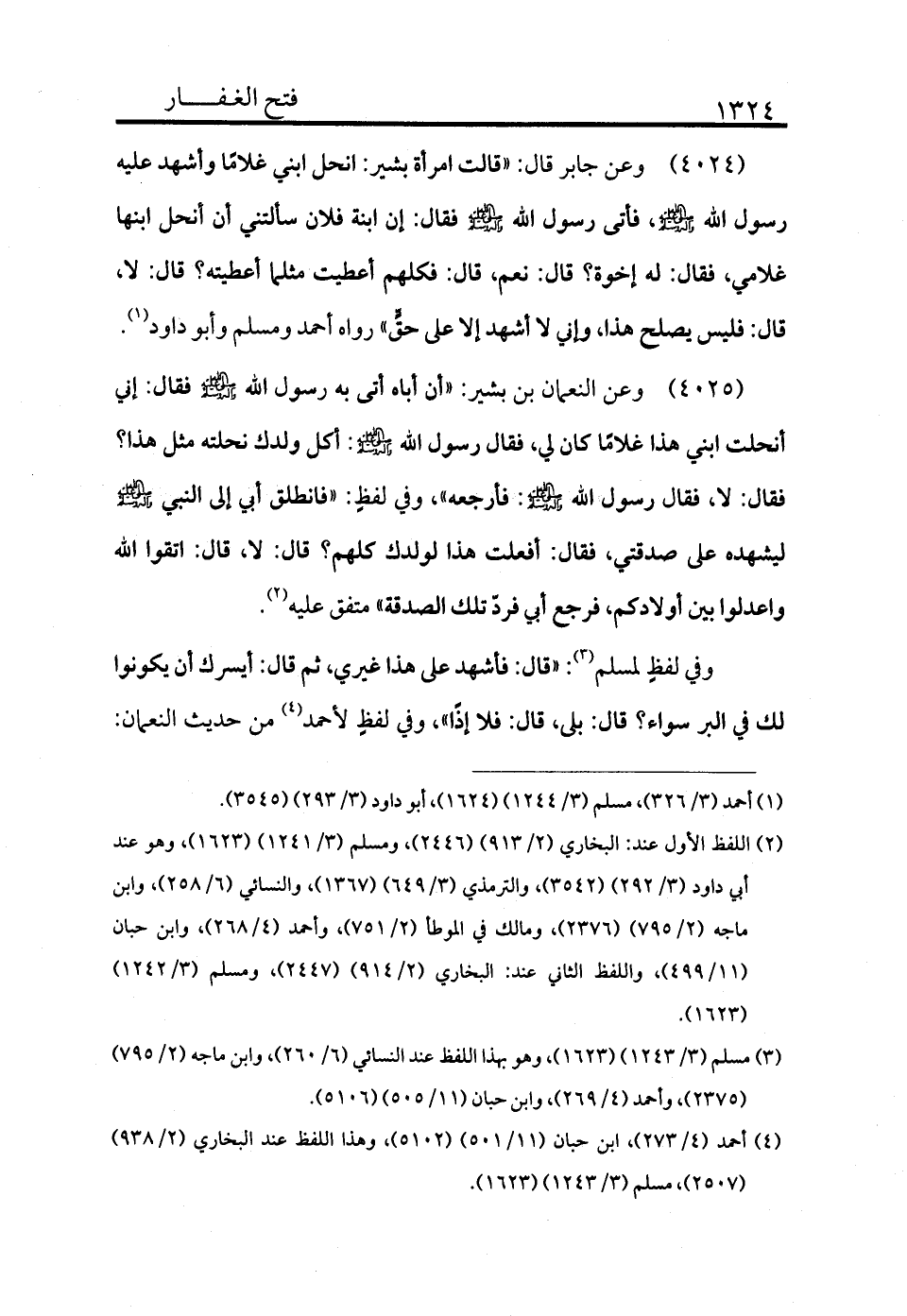 4024 - وعن جابر قال: «قالت امرأة بشير انحل ابني غلامًا وأشهد عليه رسول الله - صلى الله عليه وسلم -، فأتى رسول الله - صلى الله عليه وسلم - فقال: إن ابنة فلان سألتني أن أنحل ابنها غلامي، فقال: له إخوة؟ قال: نعم، قال: فكلهم أعطيت مثلما أعطيته؟ قال: لا، قال: فليس يصلح هذا، وإني لا أشهد إلا على حق» رواه أحمد ومسلم وأبو داود (¬1) .