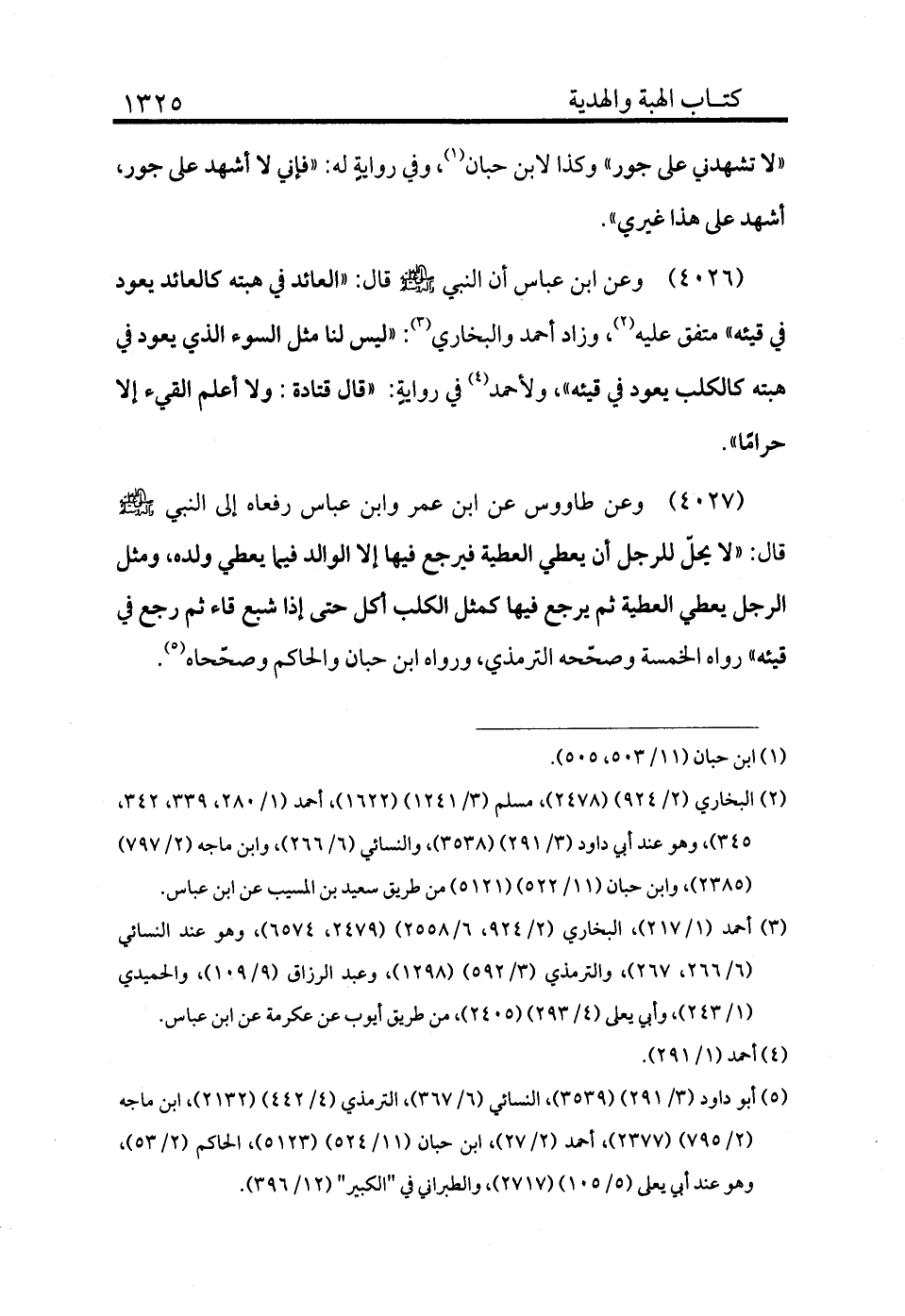 4027 - وعن طاووس عن ابن عمر وابن عباس رفعاه إلى النبي - صلى الله عليه وسلم - قال: «لا يحل للرجل أن يعطي العطية فيرجع فيها إلا الوالد فيما يعطي ولده، ومثل الرجل يعطي العطية ثم يرجع فيها كمثل الكلب أكل حتى إذا شبع قاء ثم رجع في قيئه» رواه الخمسة وصححه الترمذي، ورواه ابن حبان والحاكم وصححاه (¬5) .