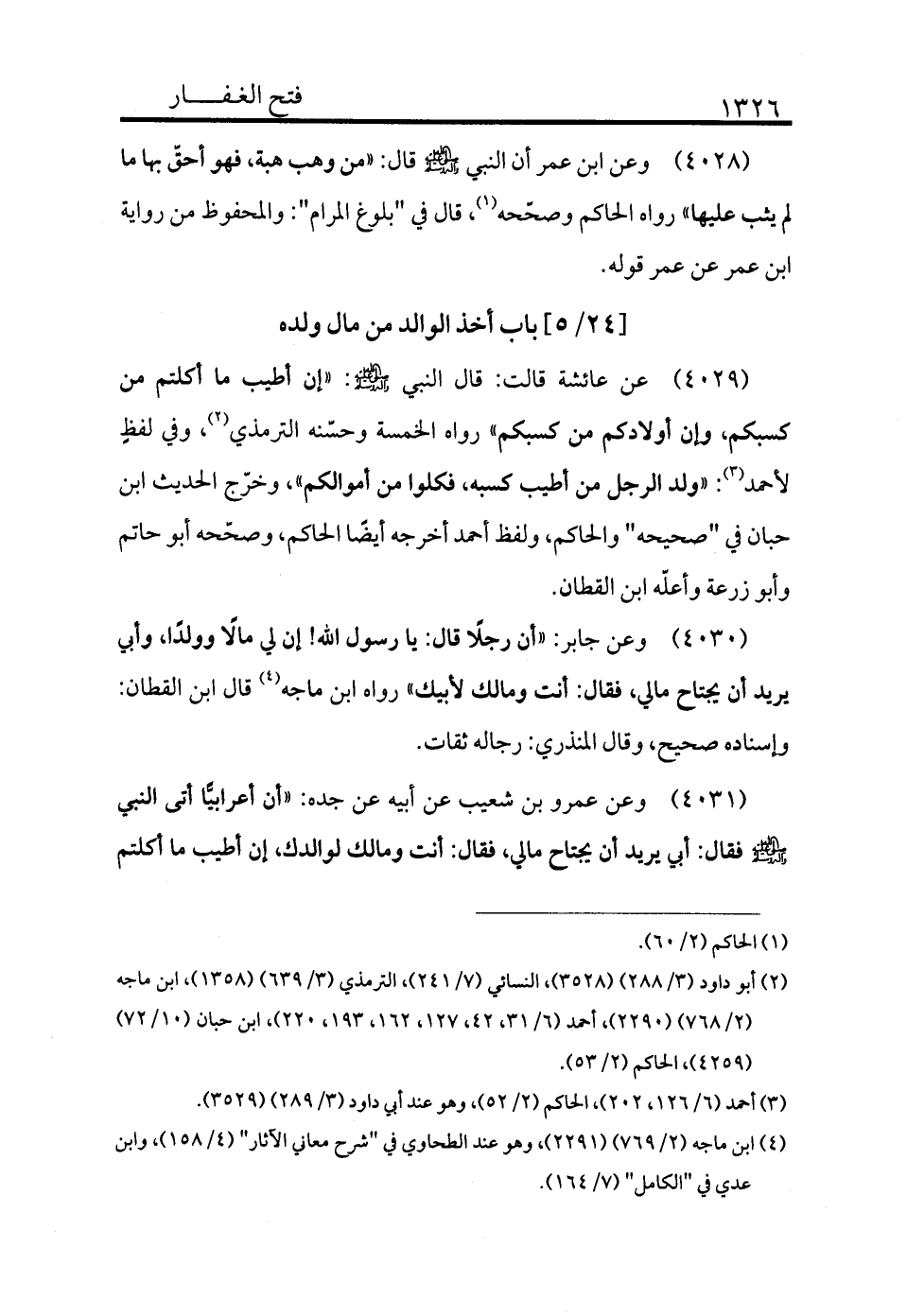 4029 - عن عائشة قالت: قال النبي - صلى الله عليه وسلم -: «إن أطيب ما أكلتم من كسبكم، وإن أولادكم من كسبكم» رواه الخمسة وحسنه الترمذي (¬2) ، وفي لفظ لأحمد (¬3) : «ولد الرجل من أطيب كسبه، فكلوا من أموالكم» وخرج الحديث ابن حبان في "صحيحه"، والحاكم، ولفظ أحمد أخرجه أيضًا الحاكم وصححه أبو حاتم وأبو زرعة وأعله ابن القطان.