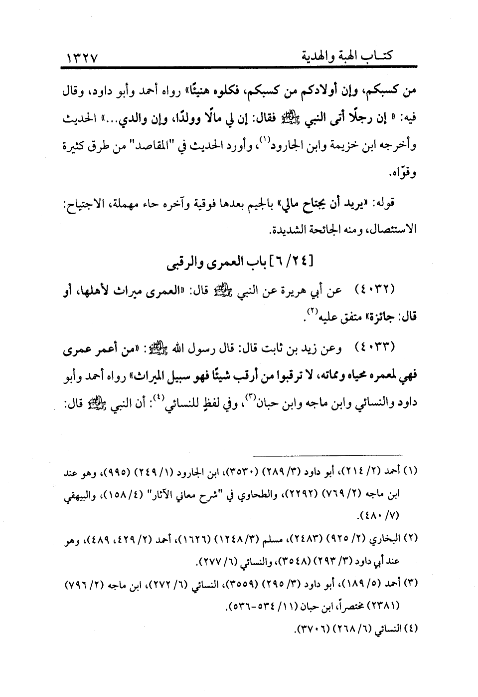 4033 - وعن زيد بن ثابت قال: قال رسول الله - صلى الله عليه وسلم -: «من أعمر عمرى فهي لمعمره محياه ومماته لا ترقبوا، من أرقب شيئًا فهو سبيل الميراث» رواه أحمد وأبو داود والنسائي وابن ماجه وابن حبان (¬3) وفي لفظ للنسائي (¬4) : أن النبي - صلى الله عليه وسلم - قال: