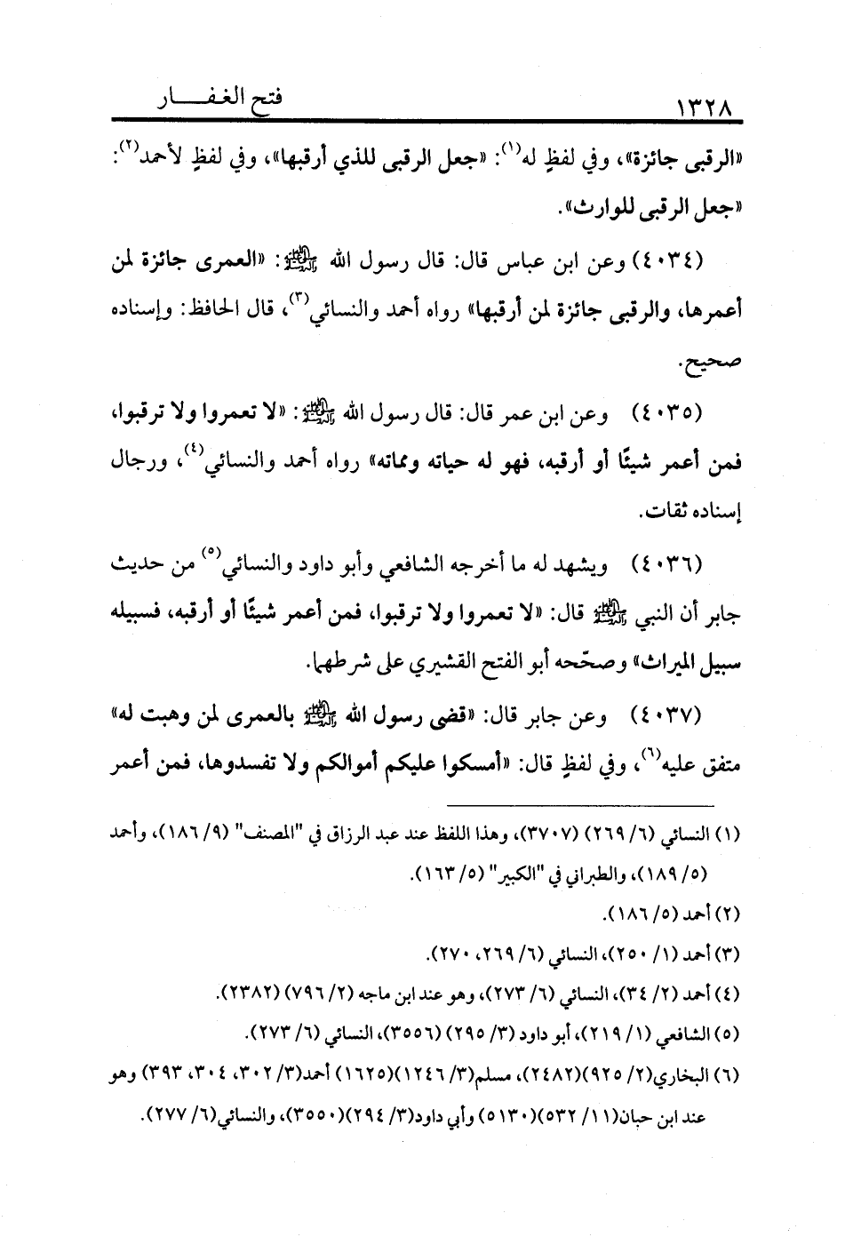 4035 - وعن ابن عمر قال: قال رسول الله - صلى الله عليه وسلم -: «لا تعمروا ولا ترقبوا، فمن أعمر شيئًا أو أرقبه، فهو له حياته ومماته» رواه أحمد والنسائي (¬4) ، ورجال إسناده ثقات.