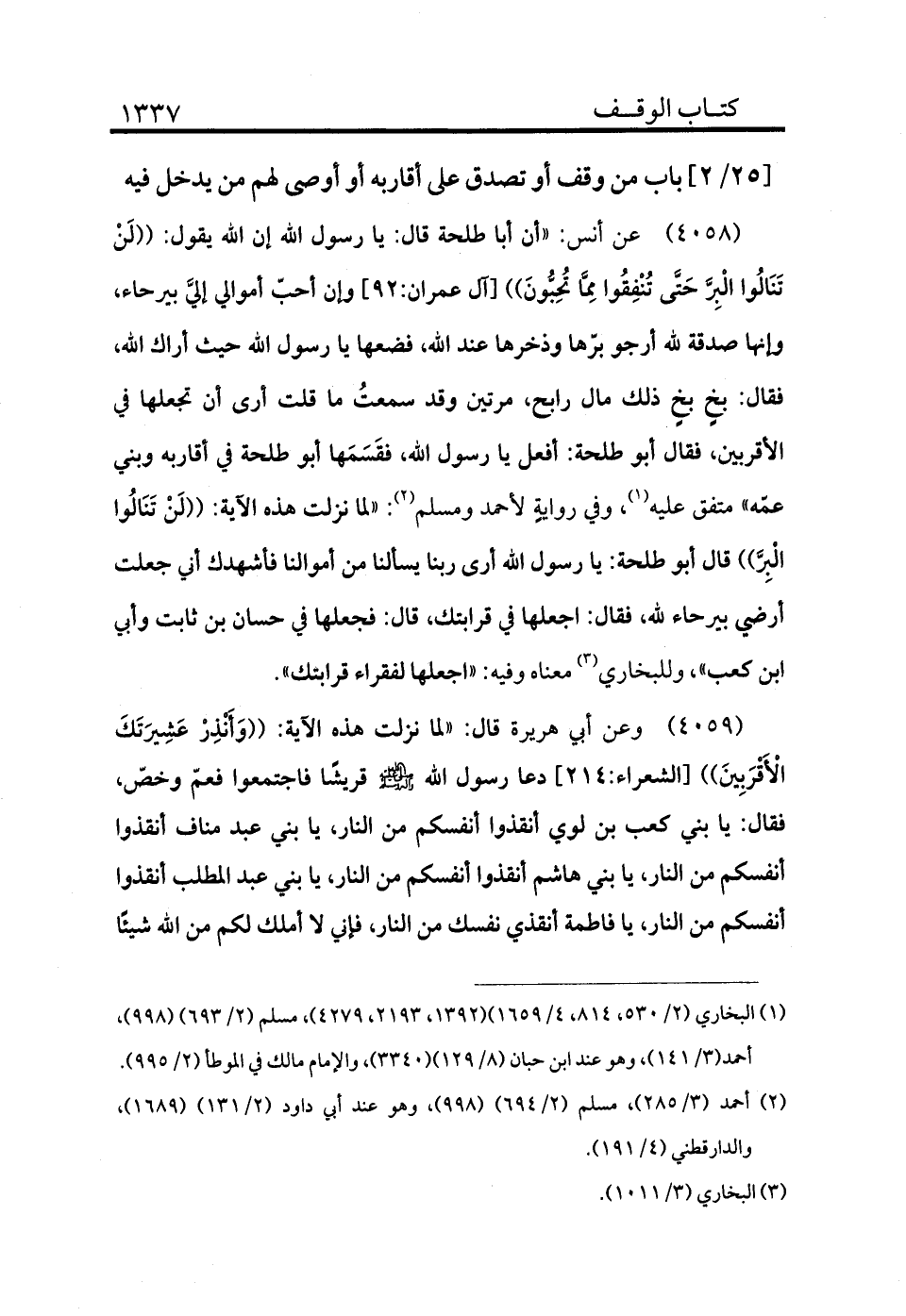 4058 - عن أنس «أن أبا طلحة قال يا رسول الله إن الله يقول: ((لَنْ تَنَالُوا الْبِرَّ حَتَّى تُنْفِقُوا مِمَّا تُحِبُّونَ)) [آل عمران:92] وإن أحب أموالي إليَّ بيرحاء، وإنها صدقة لله تعالى أرجو برها وذخرها عند الله فضعها يا رسول الله حيث أراك الله فقال: بخ بخ ذلك مال رابح مرتين وقد سمعت ما قلت أرى أن تجعلها في الأقربين فقال أبو طلحة أفعل يا رسول الله فقسمها أبو طلحة في أقاربه وبني عمه» متفق عليه (¬1) ، وفي رواية لأحمد ومسلم (¬2) : «لما نزلت هذه الآية لن تنالوا البر قال أبو طلحة يا رسول الله أرى ربنا تعالى يسألنا من أموالنا فأشهدك أني جعلت أرضي بيرحاء لله فقال اجعلها في قرابتك قال فجعلها في حسان بن ثابت وأبي بن كعب» وللبخاري (¬3) معناه وفيه: «اجعلها لفقراء قرابتك» .