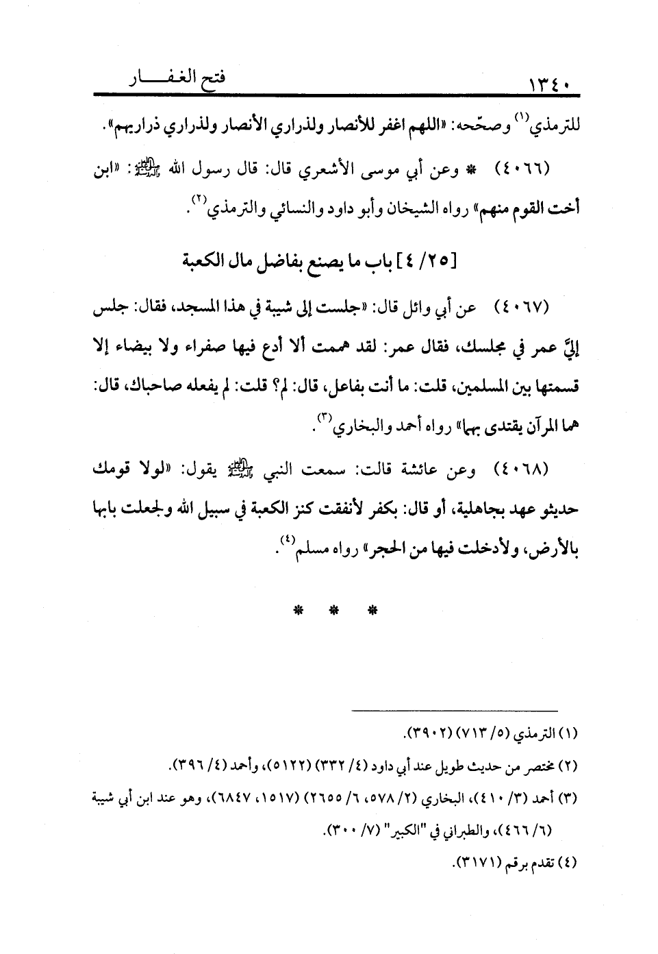 4067 - عن أبي وائل قال: «جلست إلى شيبة في هذا المسجد، فقال: جلس إليَّ عمر في مجلسك، فقال عمر: لقد هممت ألا أدع فيها صفراء ولا بيضاء إلا قسمتها بين المسلمين، قلت: ما أنت بفاعل قال: لم؟ قلت لم يفعله صاحباك، قال: هما المرآن يقتدى بهما» رواه أحمد والبخاري (¬3) .