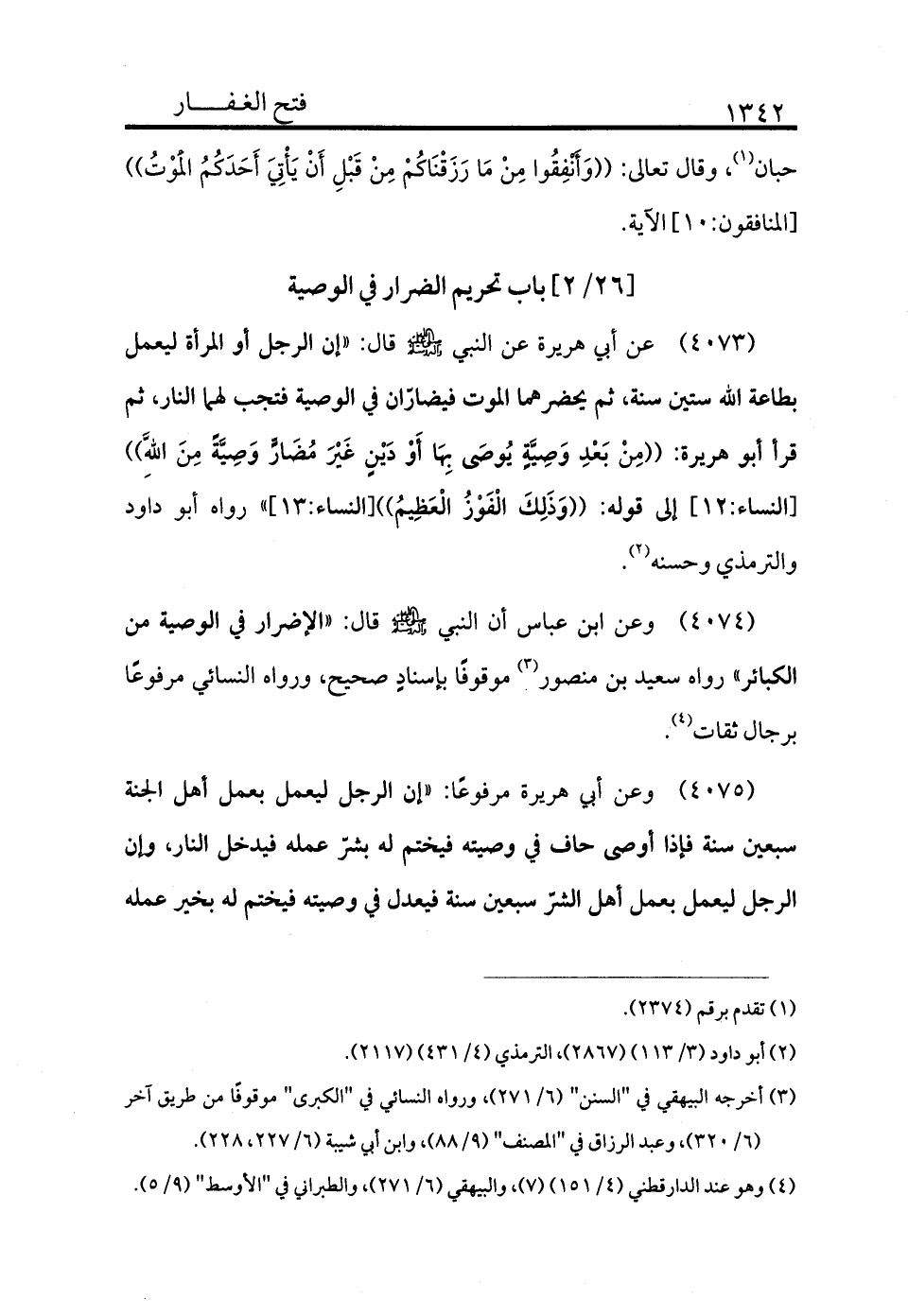 4073 - عن أبي هريرة عن النبي - صلى الله عليه وسلم - قال: «إن الرجل أو المرأة ليعمل بطاعة الله ستين سنة ثم يحضرهما الموت فيضاران في الوصية فتجب لهما النار ثم قرأ أبو هريرة: ((مِنْ بَعْدِ وَصِيَّةٍ يُوصَى بِهَا أَوْ دَيْنٍ غَيْرَ مُضَارٍّ وَصِيَّةً مِنَ اللَّهِ)) [النساء:12] إلى قوله: ((وَذَلِكَ الْفَوْزُ الْعَظِيمُ)) [النساء:13] » رواه أبو داود والترمذي وحسنه (¬2) .
