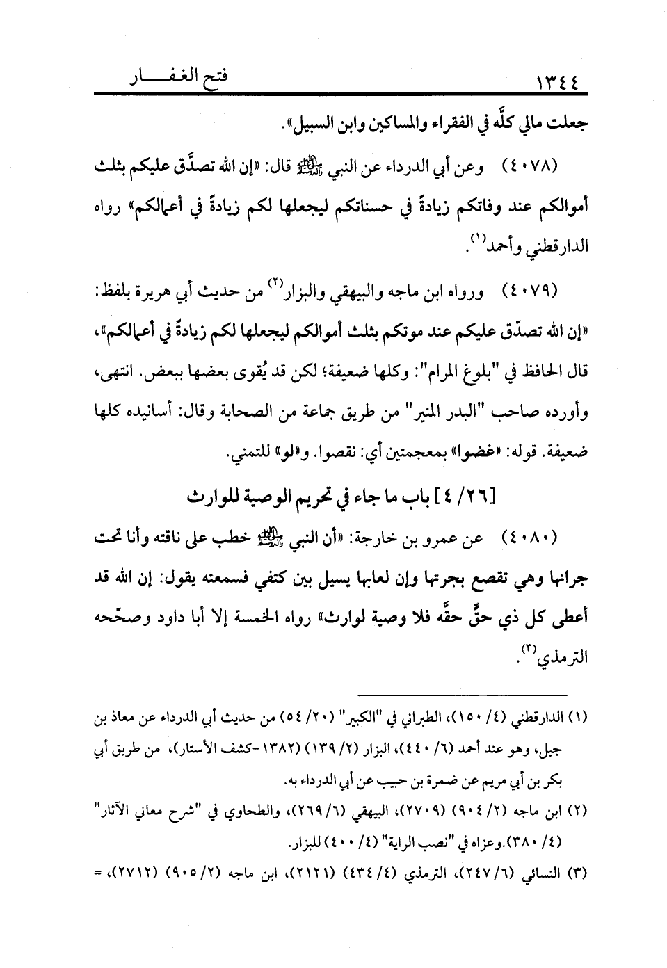 4078 - وعن أبي الدرداء عن النبي - صلى الله عليه وسلم - قال: «إن الله تصدق عليكم بثلث أموالكم عند وفاتكم زيادة في حسناتكم ليجعلها لكم زيادة في أعمالكم» رواه الدارقطني وأحمد (¬1) .