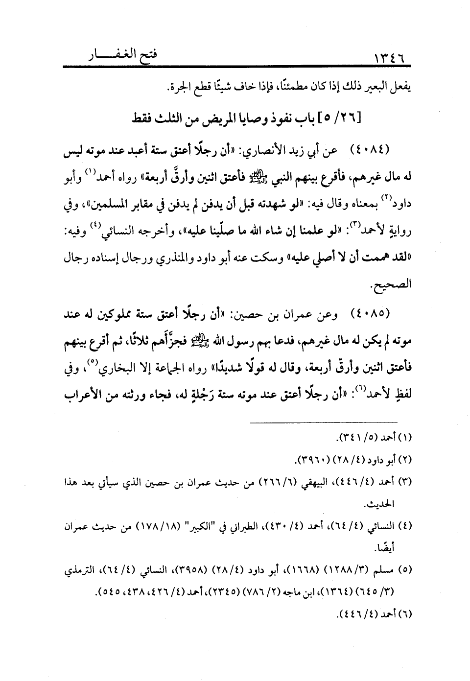 4084 - عن أبي زيد الأنصاري: «أن رجلًا أعتق ستة أعبد عند موته ليس له مال غيرهم فأقرع بينهم النبي - صلى الله عليه وسلم - فأعتق اثنين وأرق أربعة» رواه أحمد (¬1) وأبو داود (¬2) بمعناه وقال فيه: «لو شهدته قبل أن يدفن لم يدفن في مقابر المسلمين» وفي رواية لأحمد (¬3) : «لو علمنا إن شاء الله ما صلينا عليه» وأخرجه النسائي (¬4) وفيه: «لقد هممت ألا أصلي عليه» وسكت عنه أبو داود والمنذري ورجال إسناده رجال الصحيح.