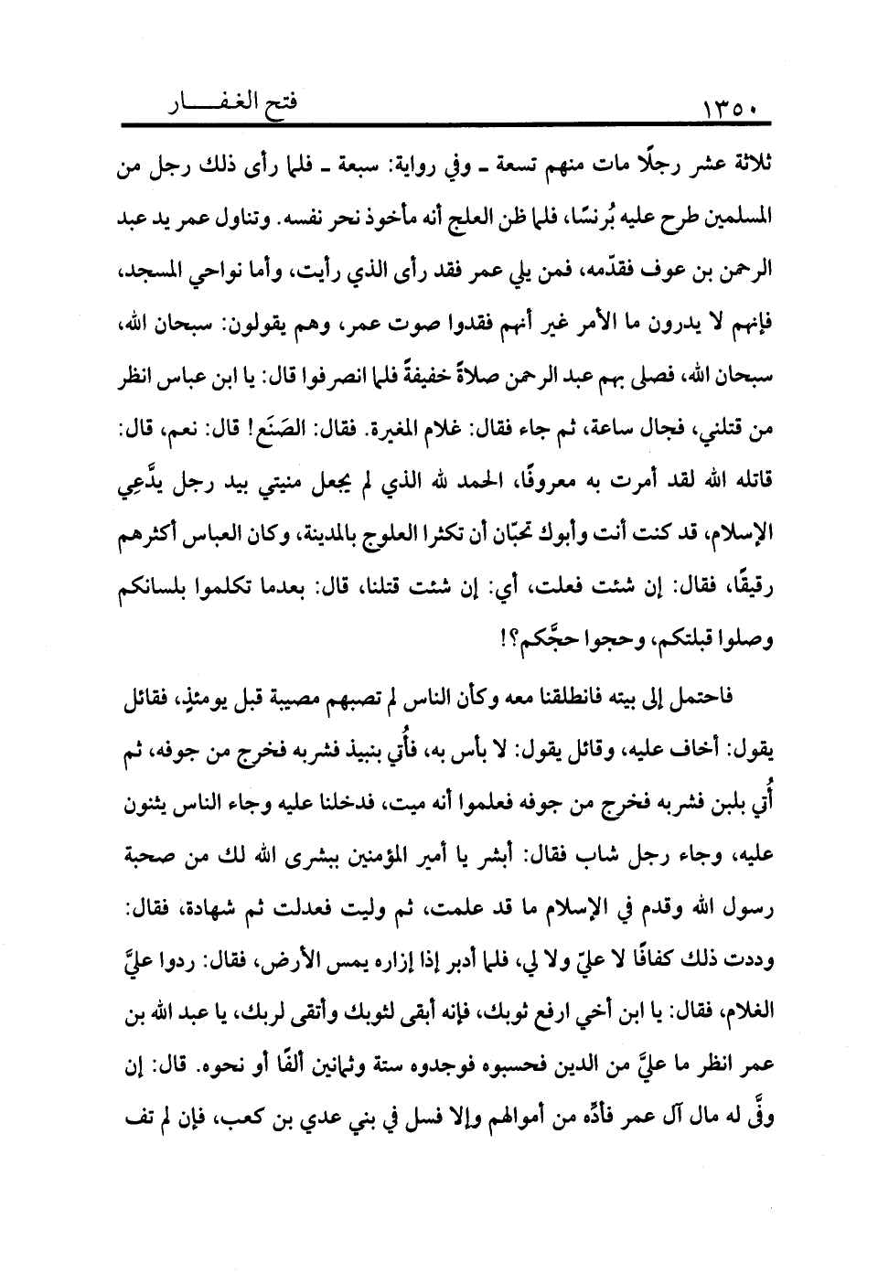 ثلاثة عشر رجلًا مات منهم تسعة، وفي رواية سبعة، فلما رأى ذلك رجل من المسلمين طرح عليه برنسيًا، فلما ظن العلج أنه مأخوذ نحر نفسه. وتناول عمر يد عبد الرحمن بن عوف فقدمه، فمن يلي عمر فقد رأى الذي رأيت، وأما نواحي المسجد، فإنهم لا يدرون ما الأمر غير انهم فقدوا صوت عمر، وهم يقولون: سبحان الله سبحان الله، فصلى بهم عبد الرحمن صلاة خفيفة فلما انصرفوا قال: يابن عباس انظر من قتلني فجال ساعة، ثم جاء فقال: غلام المغيرة. فقال: الصنع! قال: نعم، قال: قاتله الله لقد أمرت به معروفًا، الحمد لله الذي لم يجعل منيتي بيد رجل يدعي الإسلام، قد كنت أنت وأبوك تحبان أن تكثرا العلوج بالمدينة، وكان العباس أكثرهم رقيقًا، فقال: إن شئت فعلت أي إن شئت قتلنا، قال: بعدما تكلموا بلسانكم وصلوا قبلتكم، وحجوا حجكم؟!