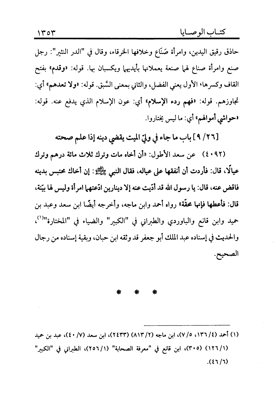 4092 - عن سعد الأطول «أن أخاه مات وترك ثلاث مائة درهم وترك عيالًا قال: فأردت أن أنفقها على عياله فقال النبي - صلى الله عليه وسلم - إن أخاك محتبس بدينه فاقض عنه قال يا رسول الله قد أديت عنه إلا دينارين ادعتهما امرأة وليس لها بينة قال: فأعطها فإنها محقة» رواه أحمد وابن ماجه وأخرجه أيضًا ابن سعد وعبد بن حميد وابن قانع والبارودي والطبراني في "الكبير" والضياء في "المختارة" (¬1) والحديث في إسناده عبد الملك أبو جعفر قد وثقه ابن حبان، وبقية إسناده من رجال الصحيح.