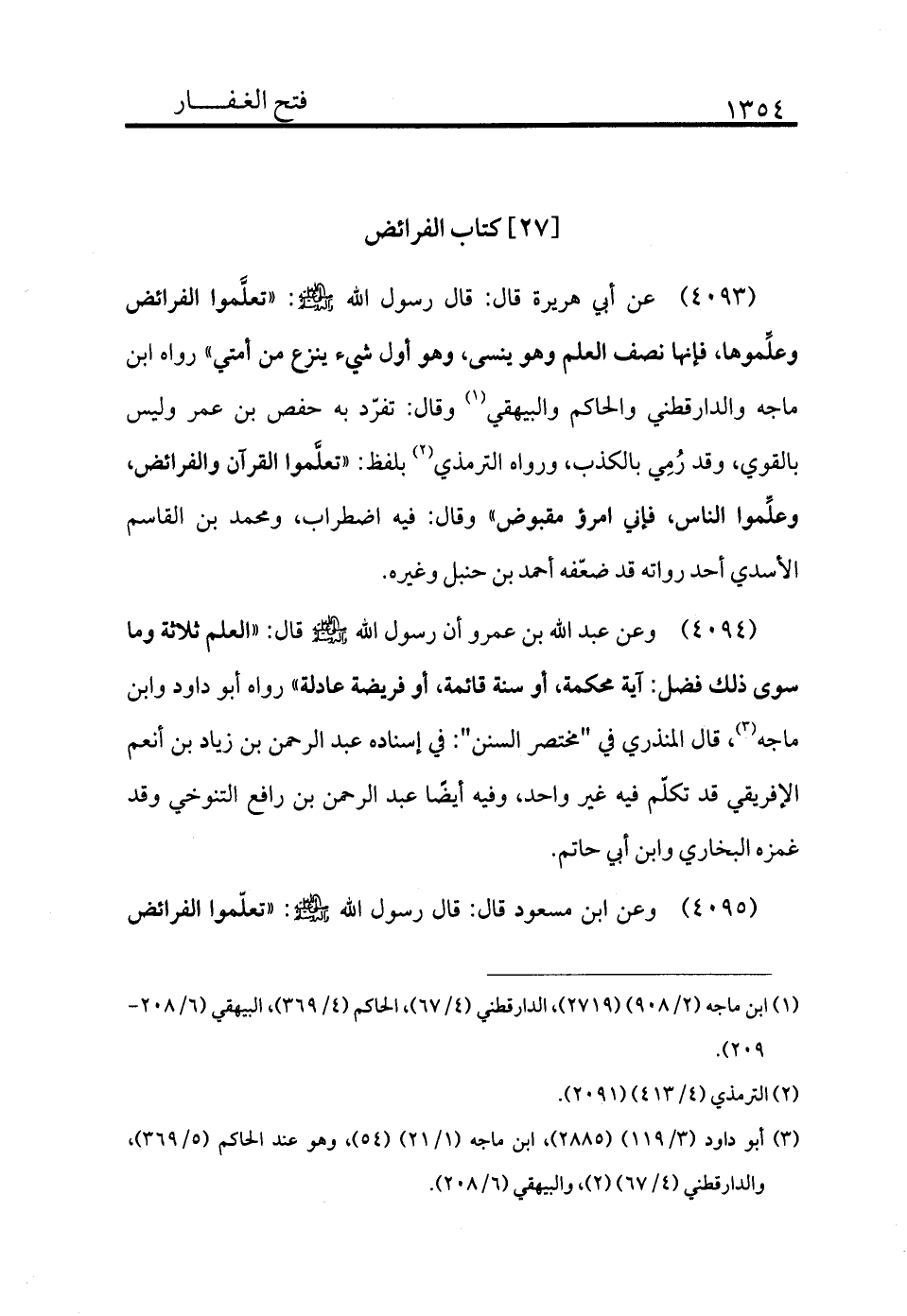 4093 - عن أبي هريرة قال: قال رسول الله - صلى الله عليه وسلم -: «تعلموا الفرائض، وعلموها فإنها نصف العلم وهو ينسى، وهو أول شيء ينزع من أمتي» رواه ابن ماجه والدارقطني والحاكم والبيهقي (¬1) وقال: تفرد به حفص بن عمر وليس بالقوي، وقد رمي بالكذب ورواه الترمذي (¬2) بلفظ: «تعلموا القرآن والفرائض، وعلموا الناس، فإني امرؤ مقبوض» وقال: فيه اضطراب، ومحمد بن القاسم الأسدي أحد رواته قد ضعفه أحمد بن حنبل وغيره.
