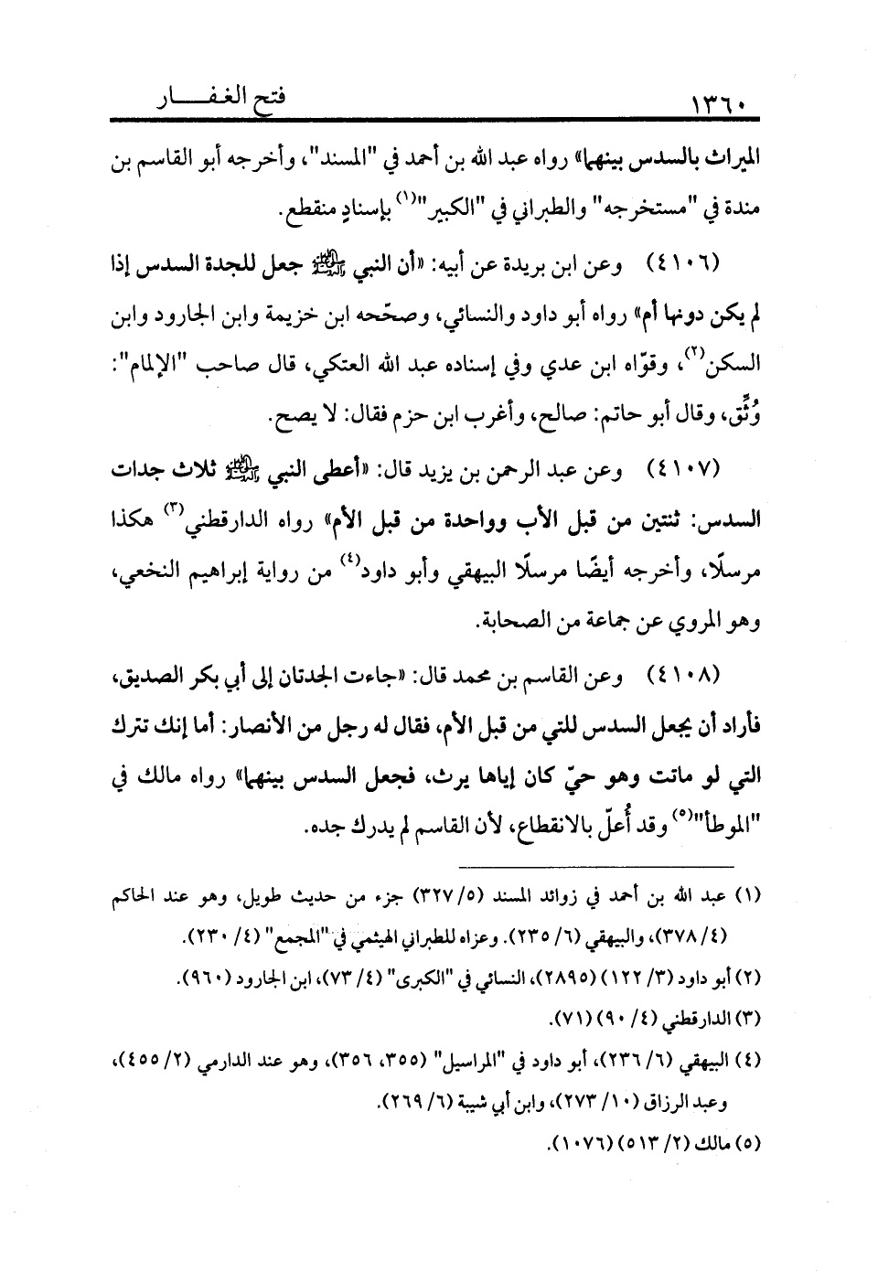 4107 - وعن عبد الرحمن بن يزيد قال: «أعطى النبي - صلى الله عليه وسلم - ثلاث جدات السدس ثنتين من قبل الأب وواحدة من قبل الأم» رواه الدارقطني (¬3) هكذا مرسلًا وأخرجه ايضًا مرسلًا البيهقي وأبو داود (¬4) من رواية إبراهيم النخعي وهو المروي عن جماعة من الصحابة.